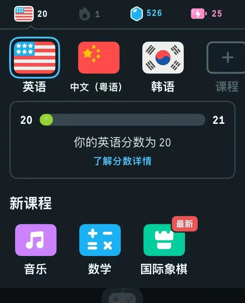 三,多邻国,这个app就很有意思,不仅可以零基础学习英语,还可以学习其他40+语言,还有数学,国际象棋,音乐等课程。