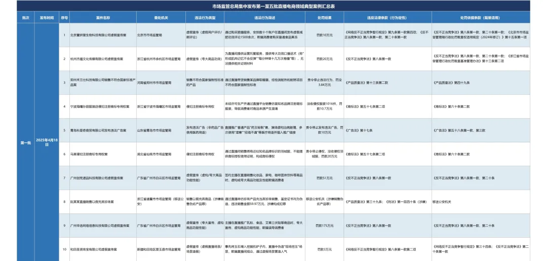 本文包括市场监管总局集中发布第一至五批直播电商领域典型案例汇总表、直播电商典型案例涉及法律依据汇总、直播电商典型案例违法行为类型分布统计三部分。请点击图片放大查看,若有需要,请扫描文末二维码,获取精美汇总版Excel。
