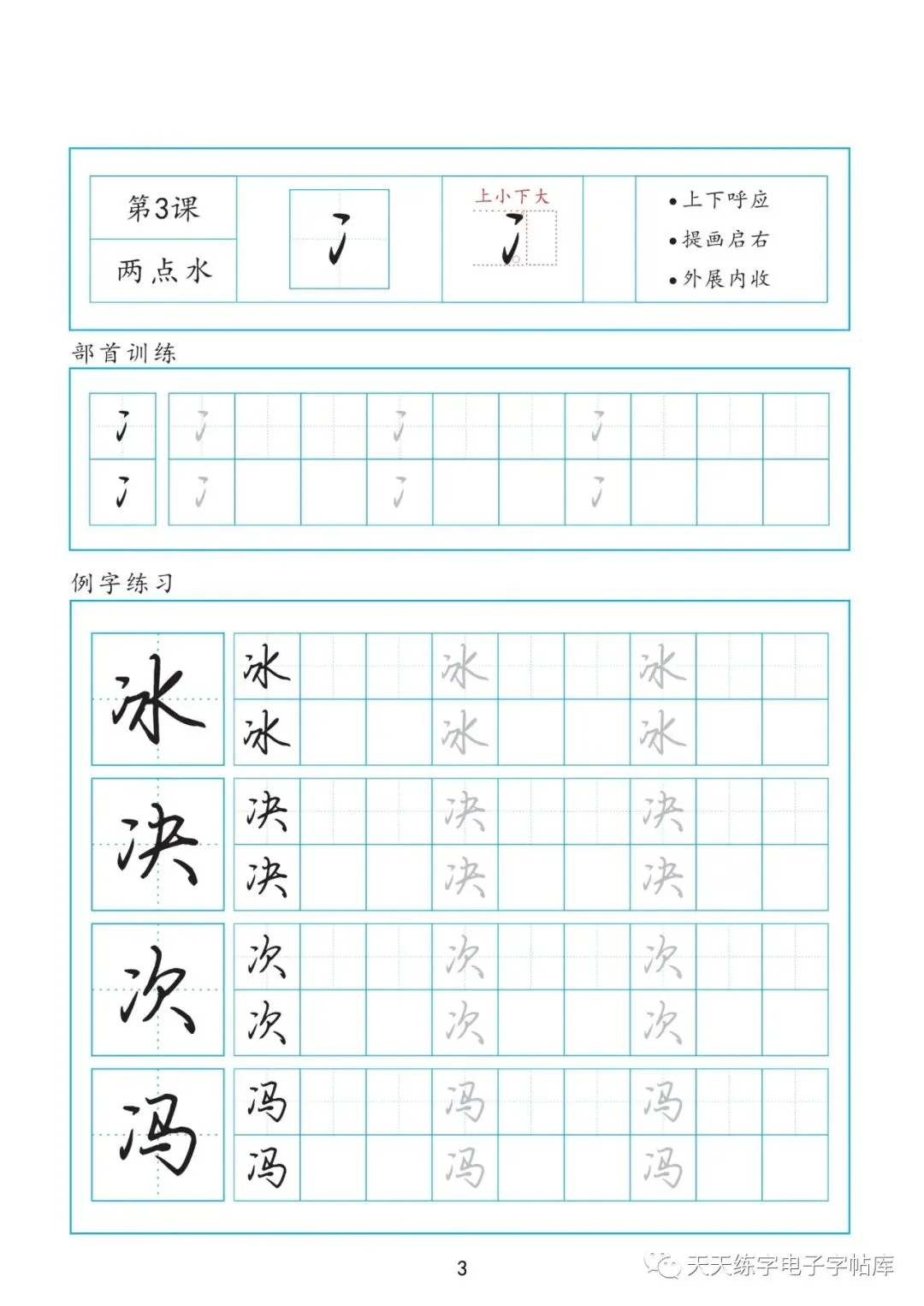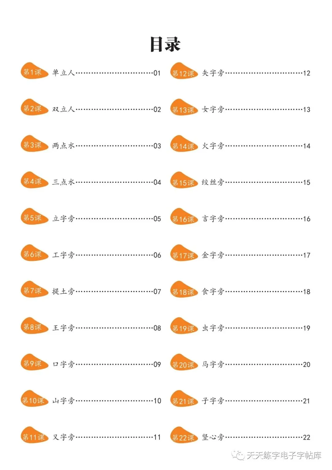 本套教程包含基本笔画35页,偏旁部首上册50页,偏旁部首下册49页,间架结构23页,高清无水印电子版pdf文件。内容展示如下