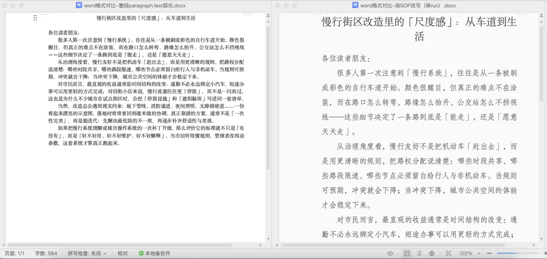 我用同一份已排版的Word 作为母版,把正文全部换成城市慢行/街区改造的公开向短文(不涉及任何真实项目或特定行业背景),然后做两次改写: