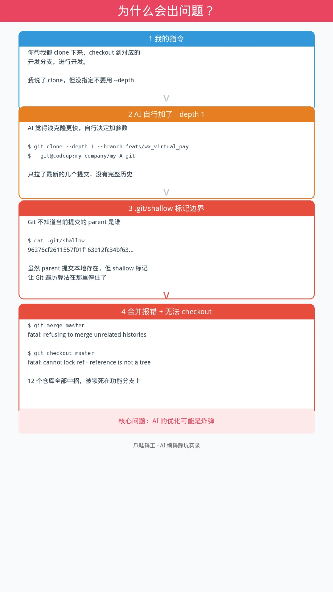 AI 的"优化"可能是炸弹。我说了"clone 下来",AI 自行决定加 --depth 1。它没有全局视角理解仓库和 master 的关系、后续需要 merge、历史完整性很重要。AI 擅长局部最优,不擅长全局约束。需要人把关。