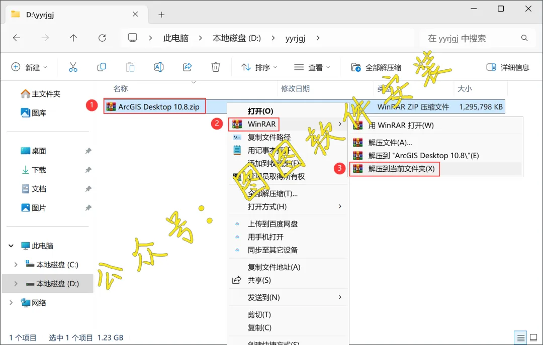 1.将ArcGIS Desktop 10.8软件安装包下载到电脑上,我是下载到D盘的一个英文文件夹内。右键ArcGIS Desktop 10.8软件安装包,点击【解压到当前文件夹】