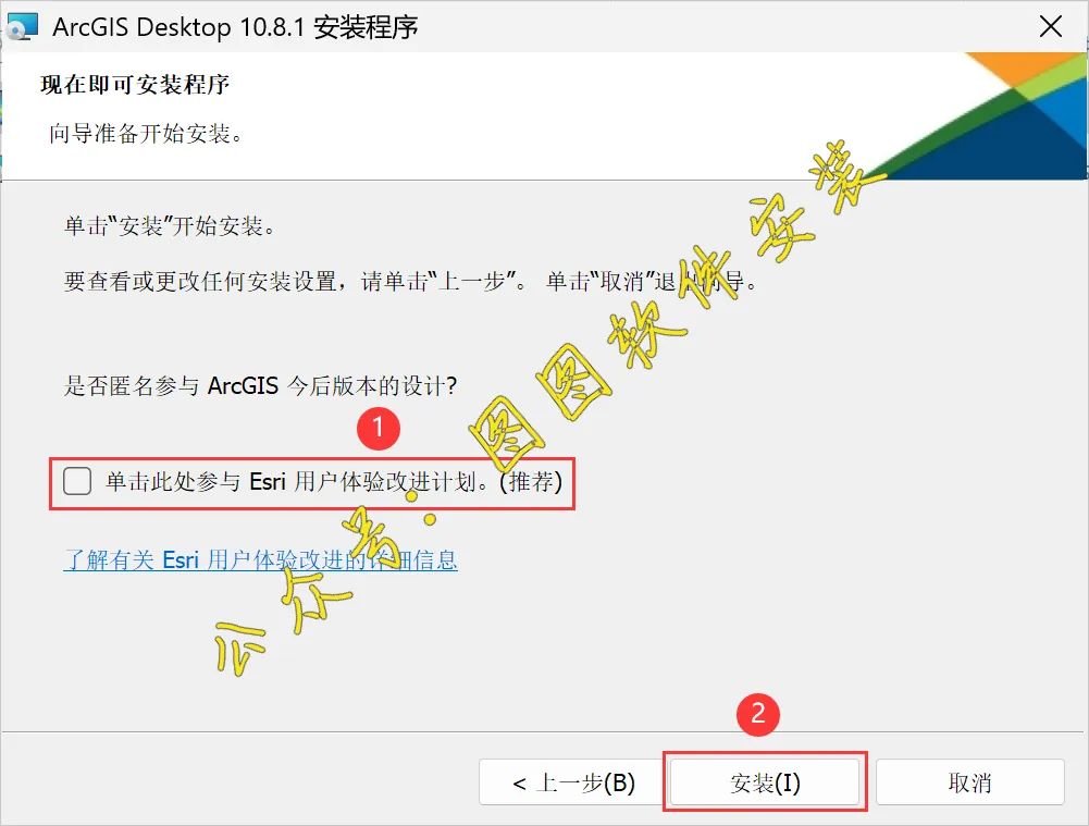 13.取消勾选【单击此处参与Esri用户体验改进计划】,再点击【安装】