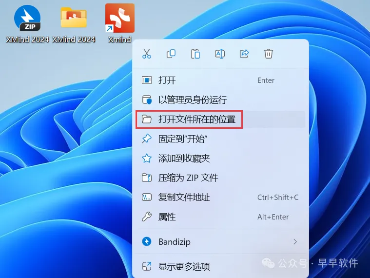 7、回到桌面,右键桌面上的【Xmind软件图标】,点击【打开文件所在的位置】
