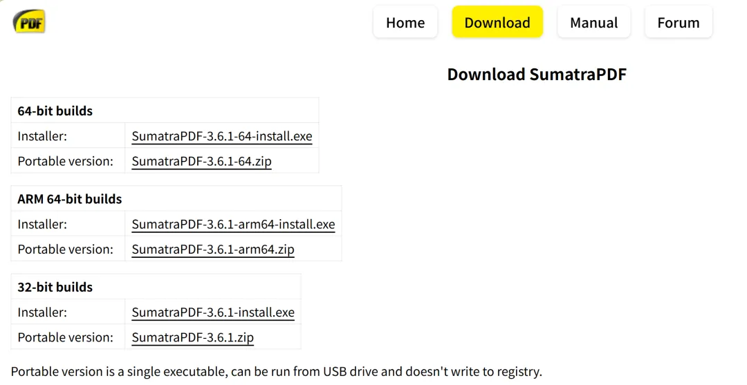 • 64位安装版:SumatraPDF-3.6.1-64-install.exe • 64位便携版(推荐):SumatraPDF-3.5.2-64.zip • 32位/ARM64:官网对应下载