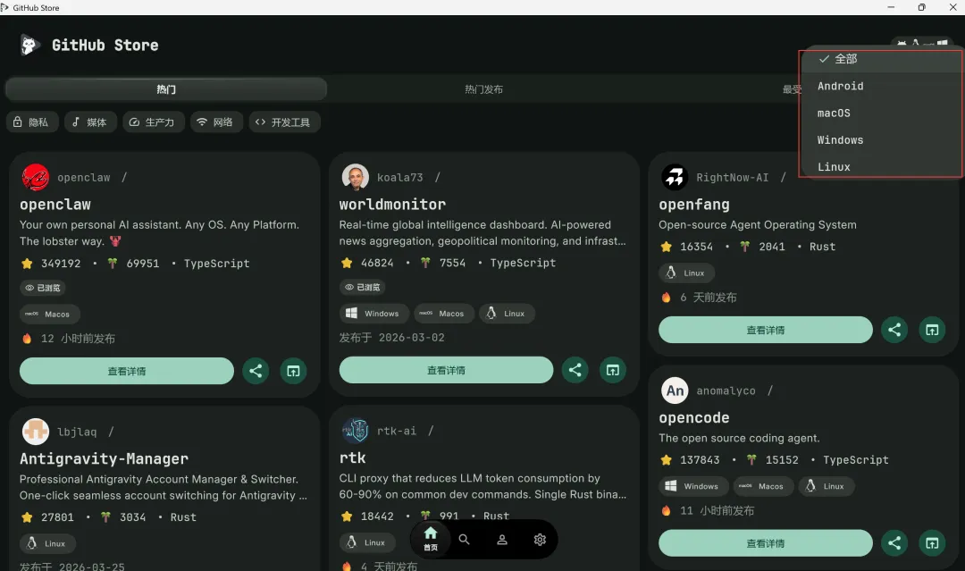 一个高中生独立开发的跨平台应用商店,让安装 GitHub 开源项目变得像使用应用商店一样简单