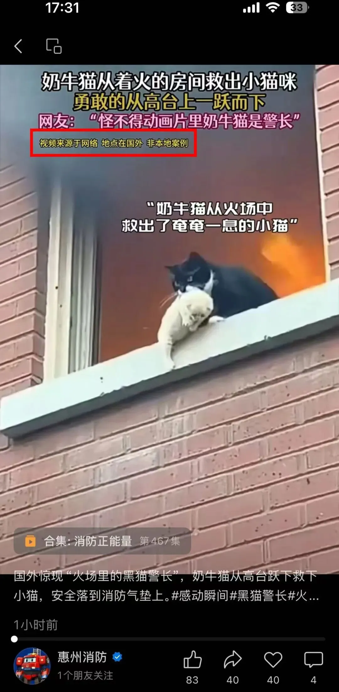 4月15日15时45分,记者联系了惠州消防,咨询其所发布的视频是真实的还是AI视频,工作人员称会向领导反馈。16时36分,工作人员联系记者称,事件发生于国外。记者询问如何判断是发生在国外以及事件是真实的还是AI视频,“网络素材,我们其实也还没有甄别出来。”记者又询问如何判断是在发生在国外,其称视频中消防员服饰是国外的,不是中国的。