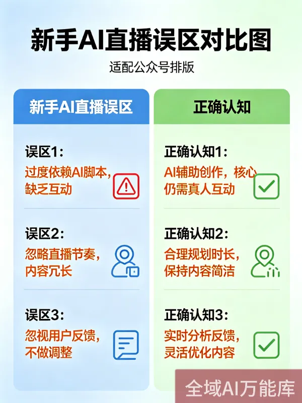 2.误区2:AI直播效果差,不如真人直播——错!AI直播能24小时不间断开播,话术流畅不冷场,还能自动回复评论,适合新手起号、低成本引流,很多新手用AI直播,3-7天就能实现稳定流量,甚至出单。