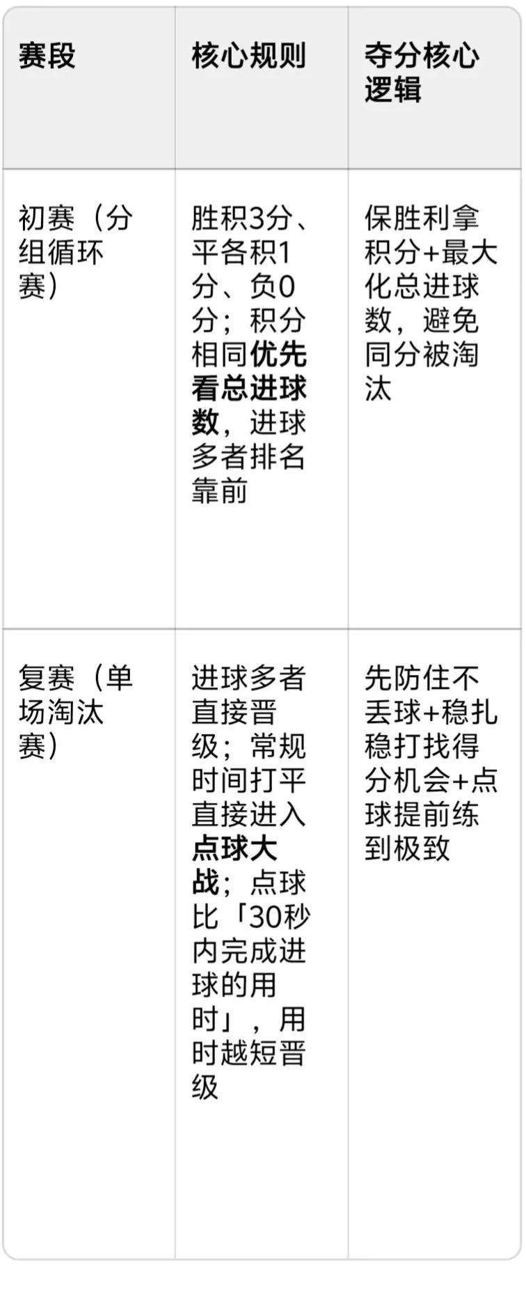 初赛核心是「积分优先,总进球兜底」,不仅要赢,还要尽可能多进球,拉开同分差距,避免被挤掉晋级名额。