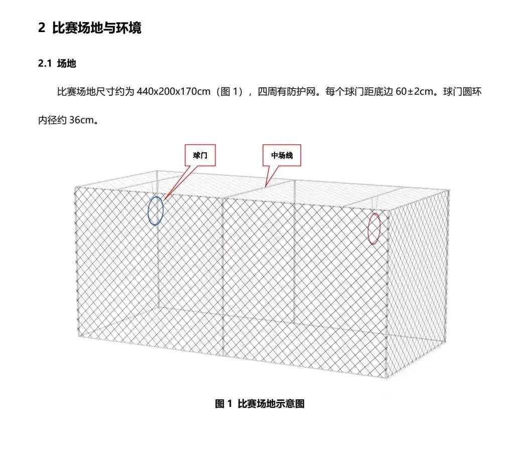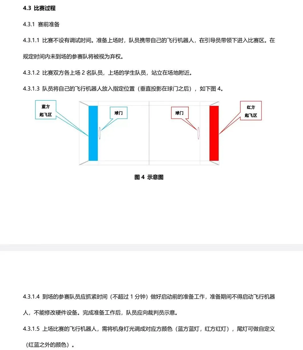 开局/设备违规:赛前无调试时间,无人机必须放在球门后,听到指令才能起飞;全场最多换2次无人机(含故障替换),换机必须经裁判同意;上场前必须把无人机机身灯光调成对应方颜色(蓝方蓝灯、红方红灯)。