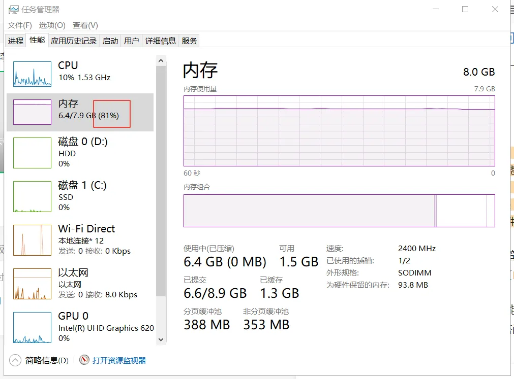 检查内存:打开「任务管理器」→「性能」→「内存」,如果内存占用长期在80%以上,说明内存不足,可考虑增加一根内存条; 检查硬盘:打开「任务管理器」→「性能」→「磁盘」,如果磁盘占用长期在90%以上,说明硬盘读写变慢(尤其是机械硬盘),可考虑更换固态硬盘(SSD),或清理硬盘里的大文件、无用文件。