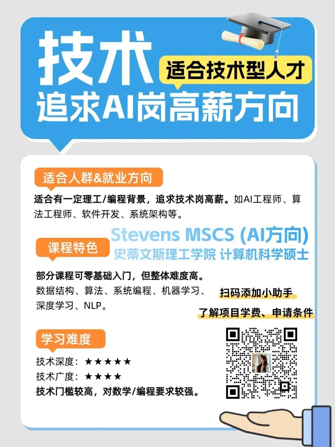 🌟HPU MSAI亮点总结:✅ 1年制全中文授课,在职可读✅ 高性价比,学费不足5W人民币✅ 毕业获全球认可硕士学位✅ 适合零基础快速转行AI的职场人点击了解学费/申请条件如果你已拥有理工科或编程基础,熟悉算法逻辑,并渴望在AI核心技术领域(如机器学习、深度学习、NLP)深耕;追求高薪的算法工程师、系统架构师或AI研发科学家职位,那么这个项目为你量身打造。史蒂文斯理工学院(Stevens Institute of Technology,简称Stevens)始创于1870年,是美国历史最为悠久的研究型私立理工大学。史蒂文斯理工学院是美国理工强校,与麻省理工、加州理工、伦斯勒理工学院并称为全美四大理工。与麻省理工、加州理工、卡内基梅隆大学等22所高校同为独立科技大学联盟创始成员。通过数据结构、算法、系统编程等高阶课程,为你构建坚不可摧的计算机科学核心能力与前沿AI技术理解。虽然学习强度大、对数学和编程要求高,但回报同样丰厚:顶尖企业的广泛认可、强大的校友网络、密集的项目实战,将直接为你铺设通往科技大厂核心研发岗位的黄金路径。点击了解学费/申请条件🌟Stevens MSCS亮点总结:✅高就业率:超过97%的硕博毕业生在毕业6个月内找到工作✅最值得读的美国CS之一:投资回报率最高的大学计算机科学专业第3(仅次于MIT和哈维穆德学院)✅院校认可度高:被誉为全美四大理工之一,毕业生受硅谷科技大厂偏爱✅地理位置开挂:坐拥纽约金融圈+新泽西科技带✅对中国职场人友好:支持纯线上/混合制学习模式,证书和留学生完全一致,赴美可获得3年OPT彼岸教育连接全球优质资源,与多所海外名校合作,“条条大路通”彼岸让好学者有更适合的学位项目,让奋斗者向目标更进一步。我们目前已为35W+人提供在线硕博咨询服务,为更多中国职场人带来深造机会,热门的计算机科学/医疗健康管理/人工智能/MBA/心理学等专业火热招生中!