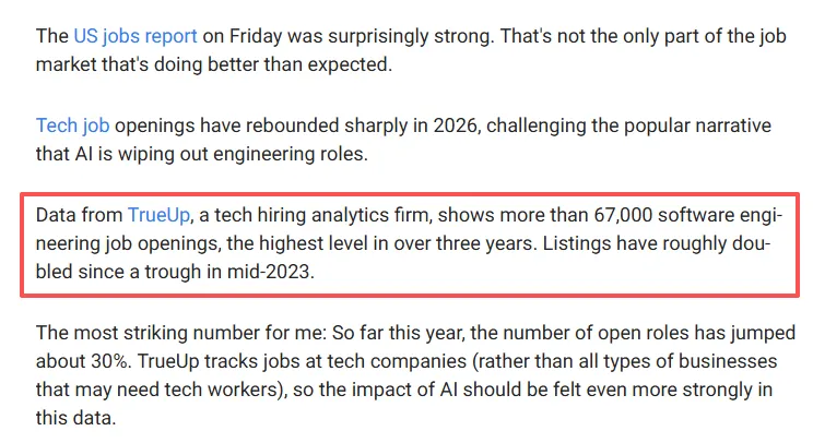 TrueUp创始人直言:“很多关于AI取代工程师的说法,目前并没有得到招聘数据的验证。”
