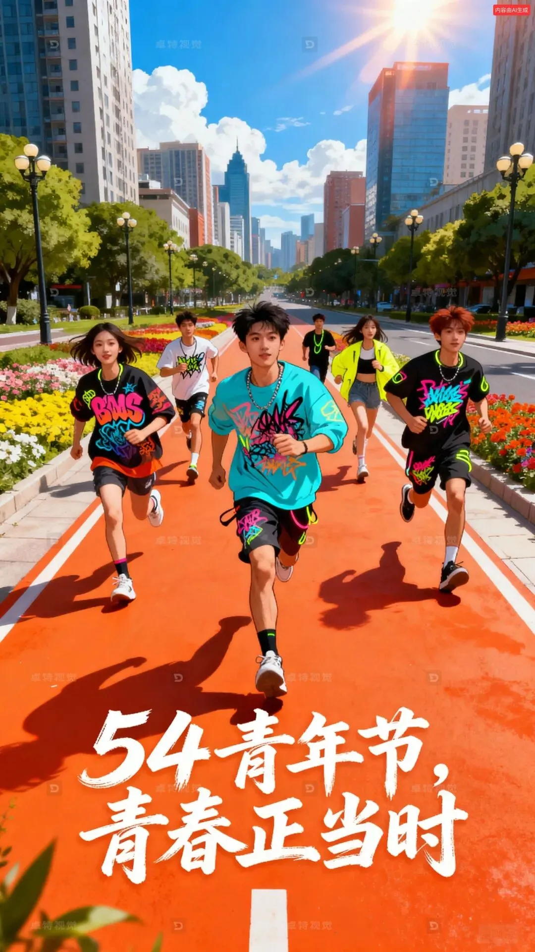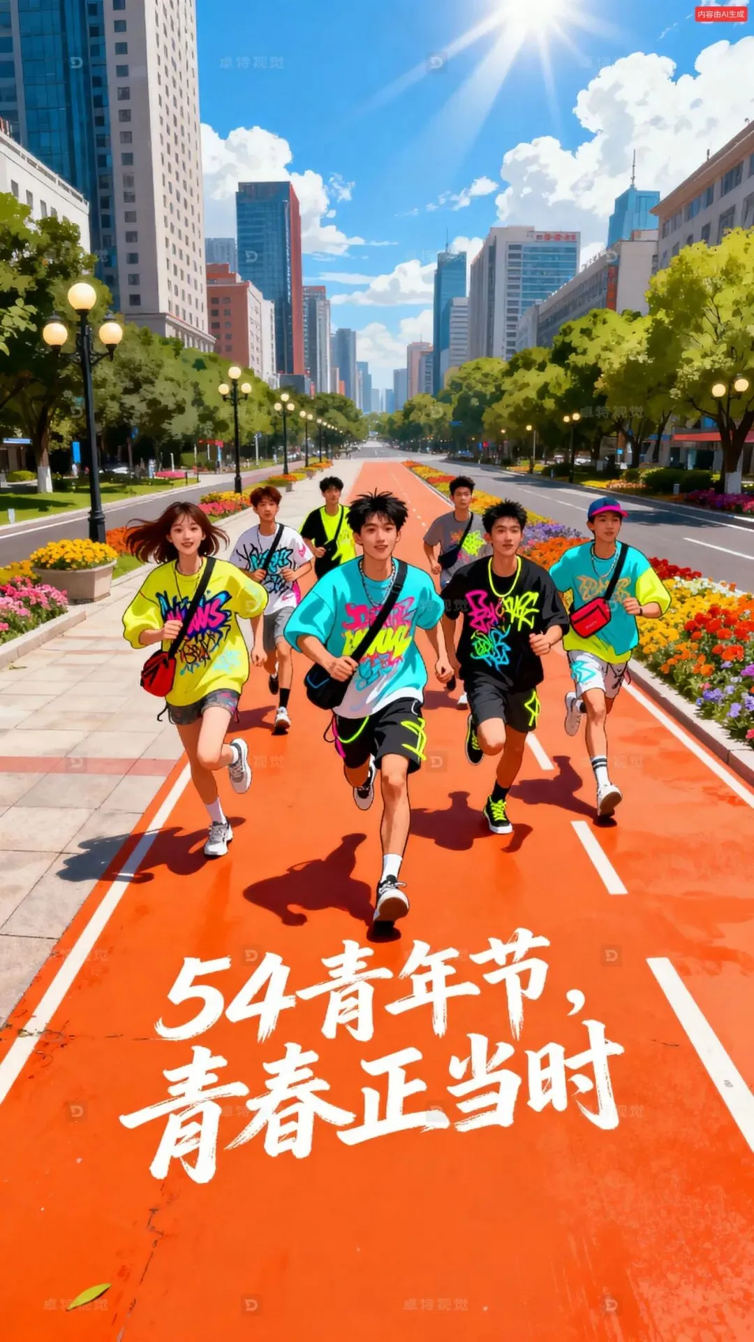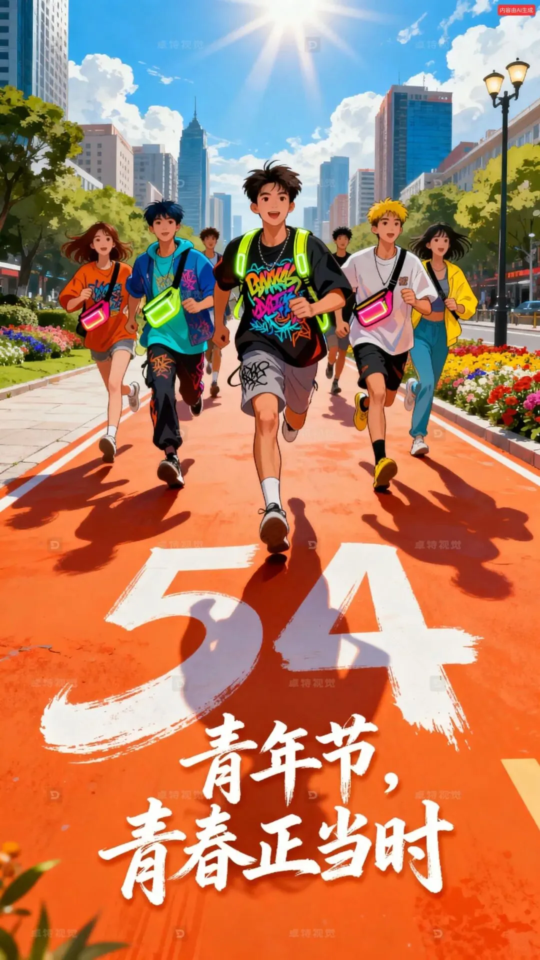 插画风格,橙红、青蓝、明黄配色营造青春活力感,俯视45度视角下有一群穿潮流服饰(含涂鸦、荧光等元素)挎包的中国青年有男有女迎面在橘红色大路上向镜头奔跑而来,前景大路上面有白色秀丽笔“54青年节 青春正当时”字体,背景为繁华城市(高楼、绿树、花坛、路灯),远处蓝天白云阳光万丈,画面具空间感 。