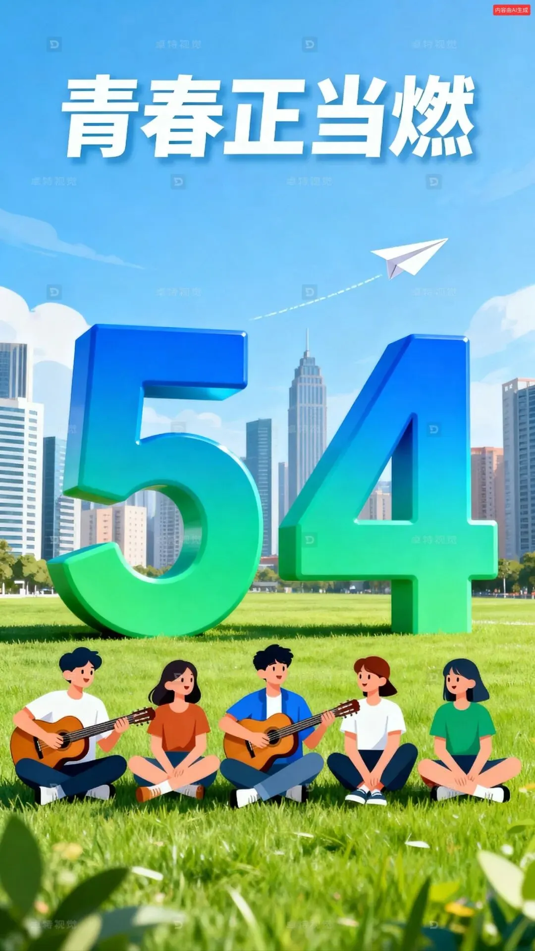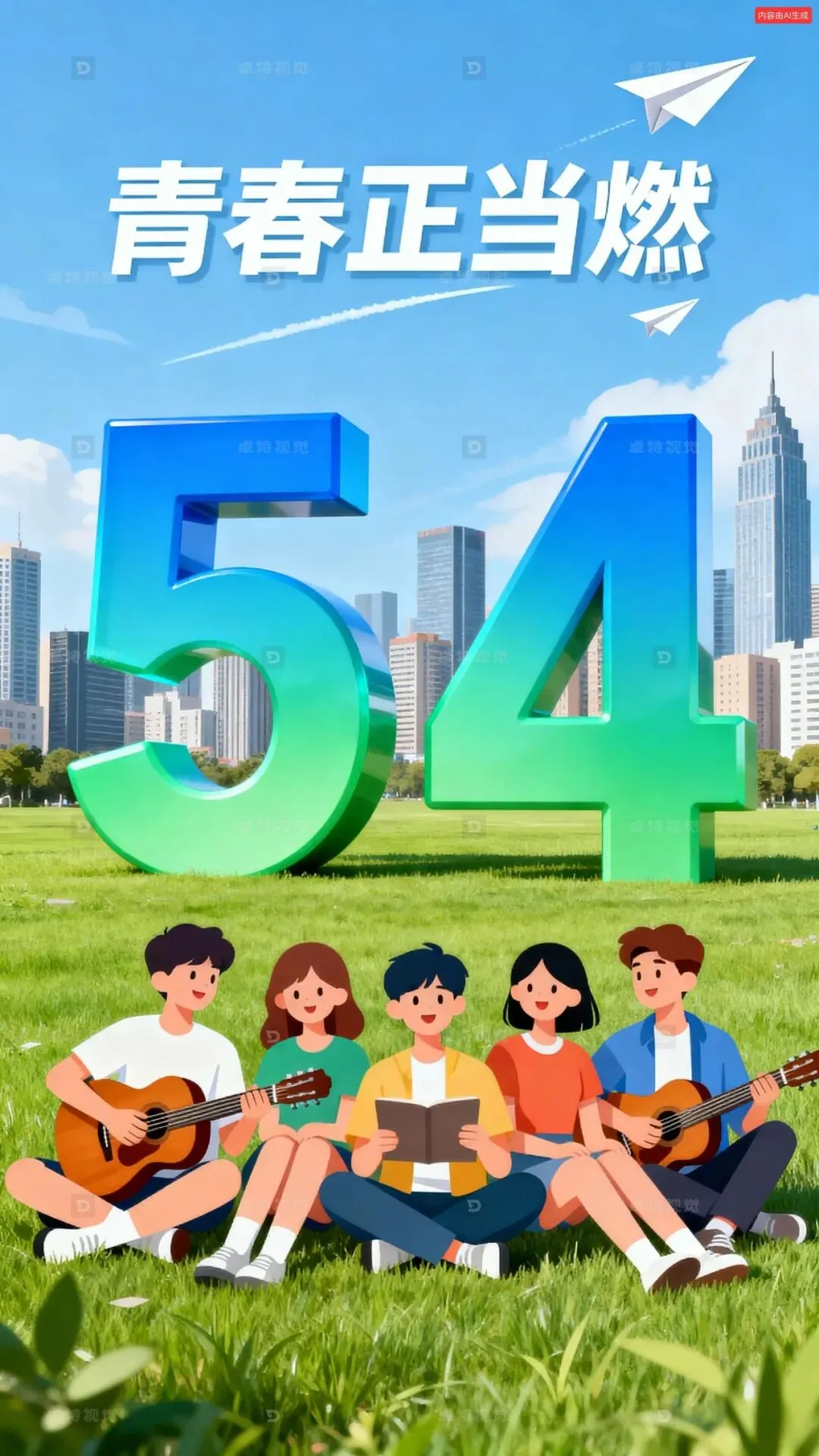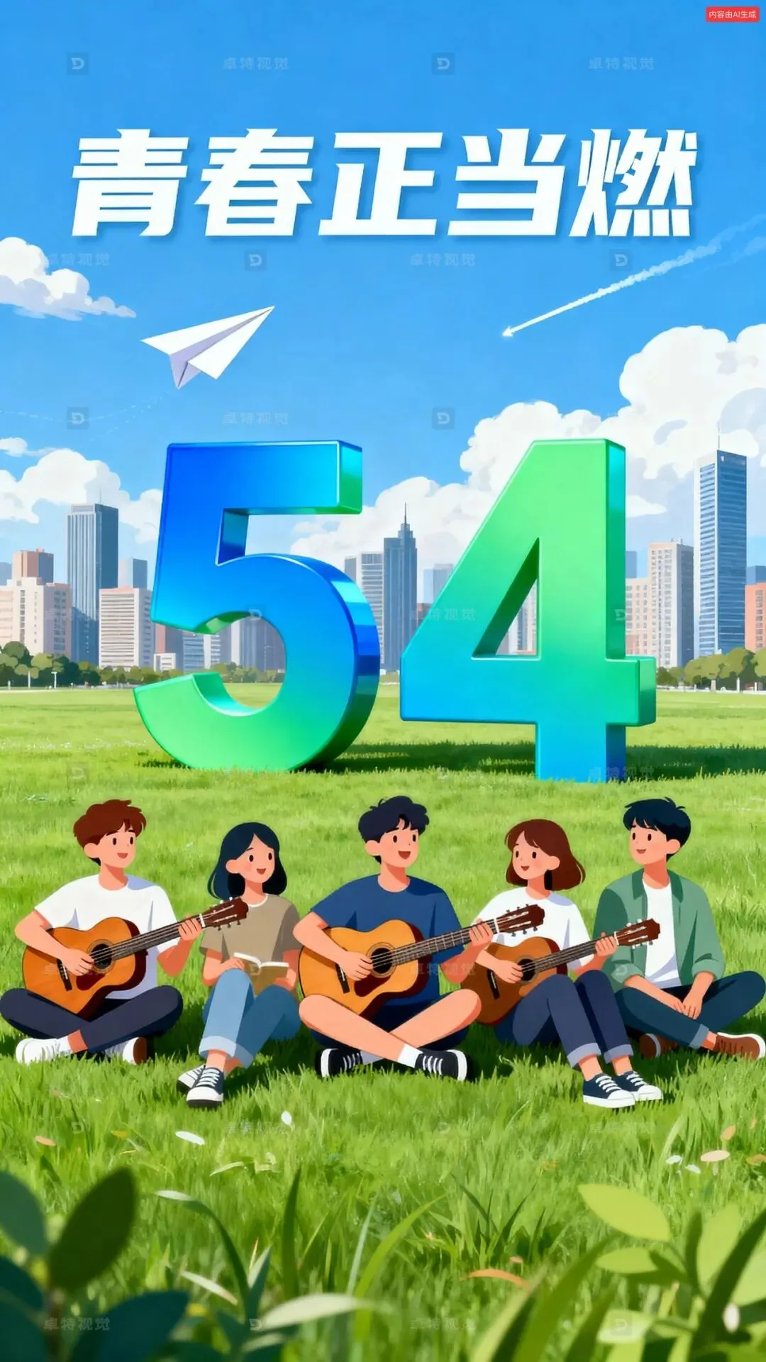 以五四青年节为主题,打造青春活力风格画面。画面中上是由蓝绿渐变色大大的“5”和“4”立体数字造型立在草坪上,在五四的时光里,青春如跳动的音符。扁平化风格的5个青年男女坐在草地上,人物详细细节,手中吉他轻响,旋律与梦想共舞。背后城市高楼林立,似在见证他们的朝气与锋芒。纸飞机划破天际,载着青春的憧憬飞翔,蓝天白天,整体风格青春、活力,主标题“青春正当燃”。