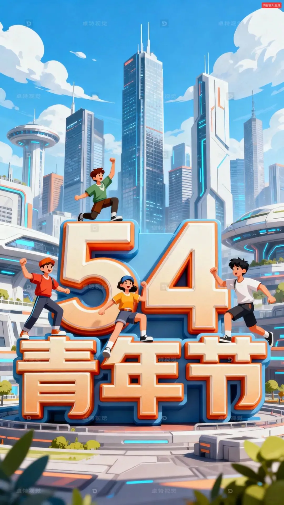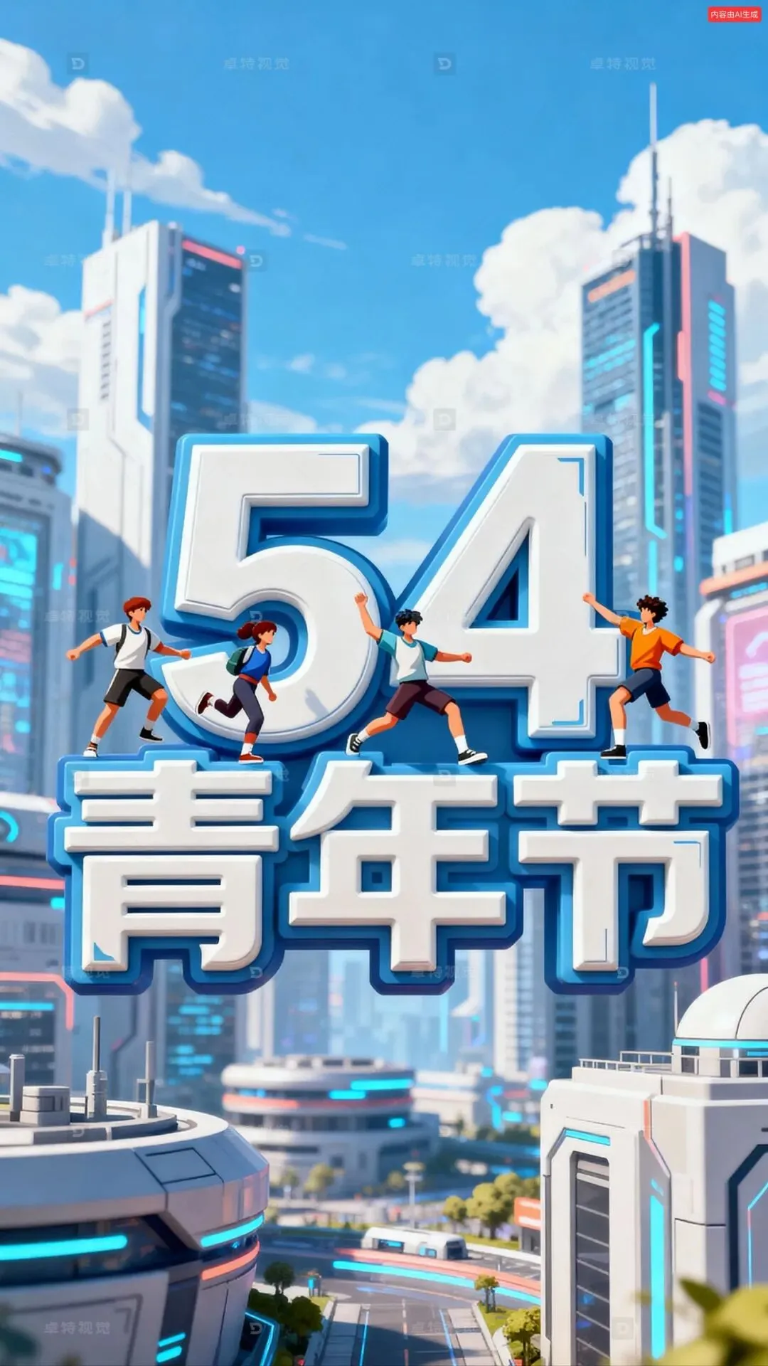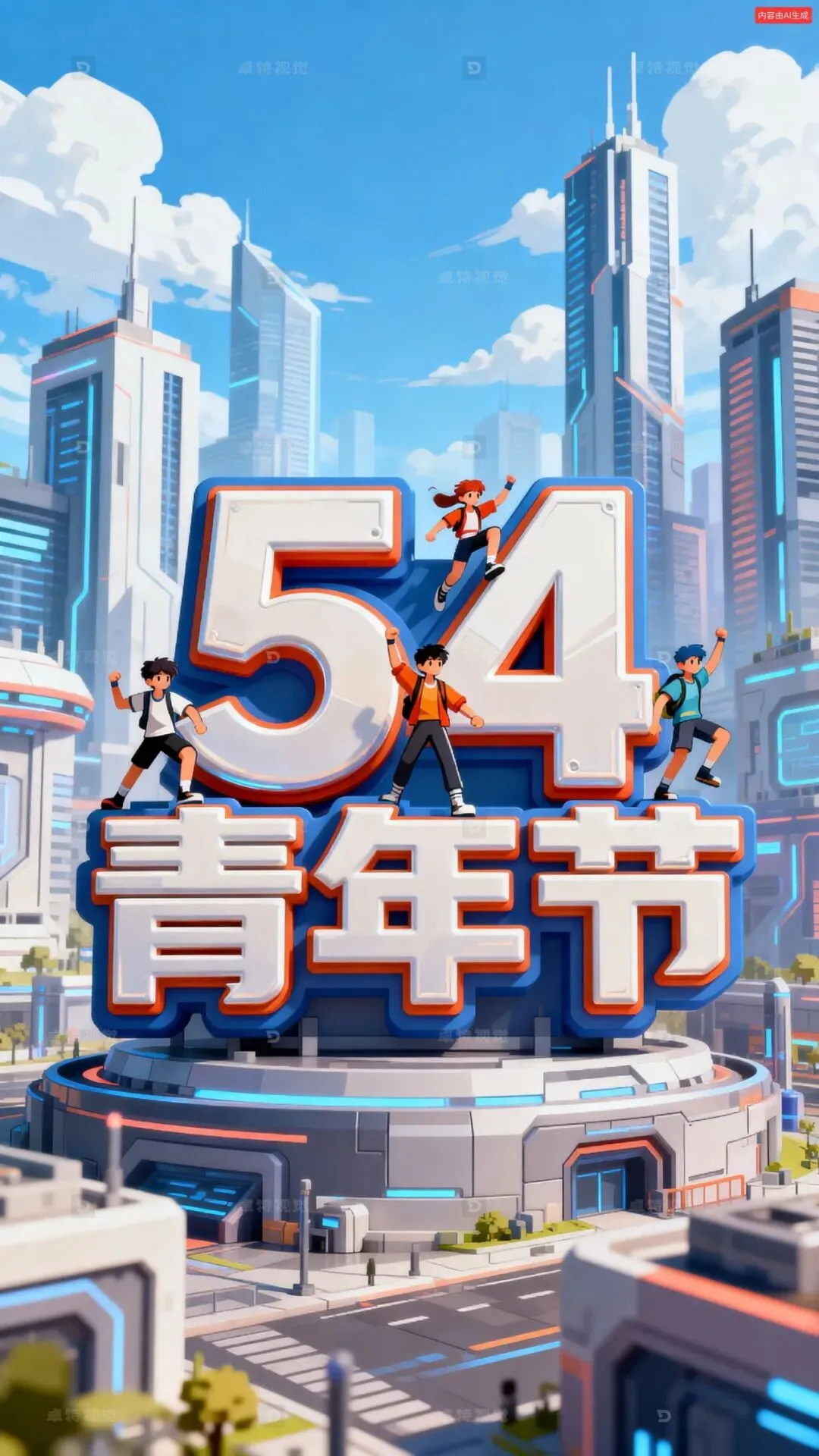生成一张青年节的海报,背景是虚化的发达未来城市,游戏风格,中间有一个立体字“54 青年节”,整体扁平插画,矢量图,浮雕,立体字体上有几个活力四射的年轻人,3D渲染,背景是虚化的城市,高楼大厦,现代城市,背景是蓝天白云,活力四射的画面,青春活力的氛围,庆祝节日,高清细节。
