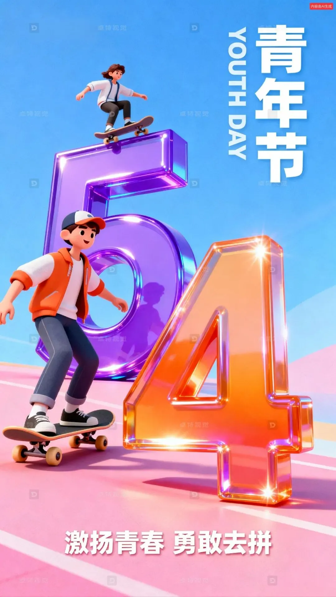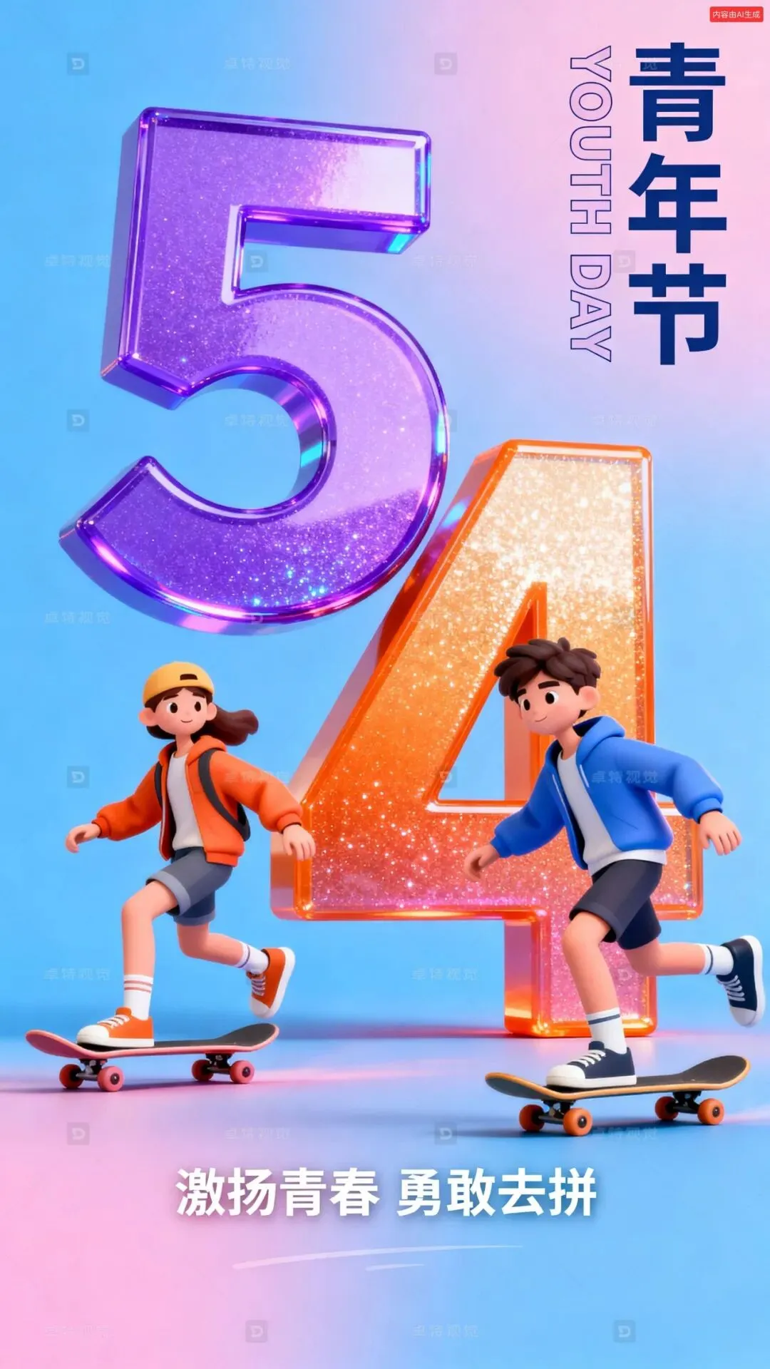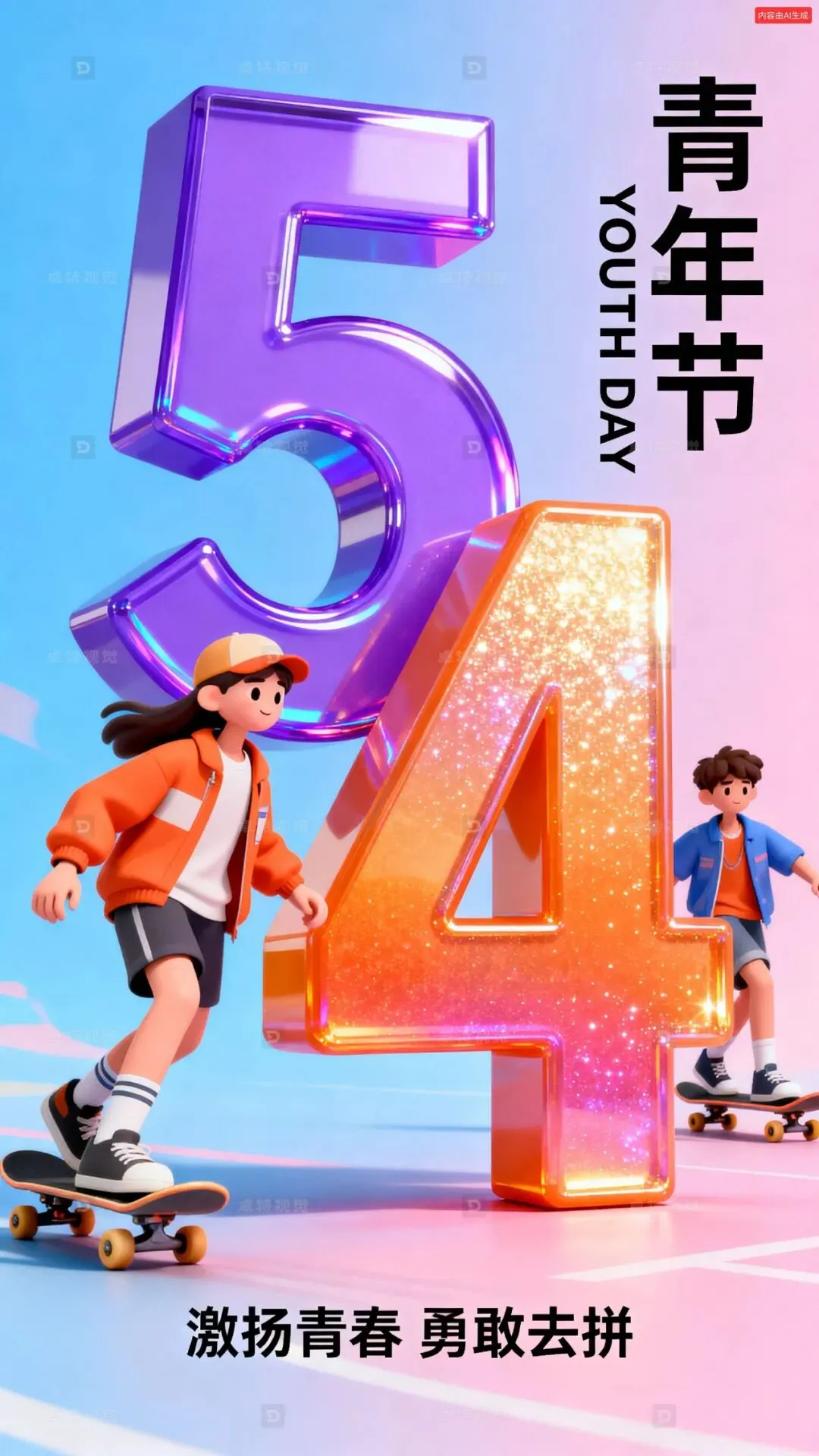 一张以青年节为主题的海报,画面中有两位身着时尚服饰的年轻人在滑板上尽情运动,背景为蓝粉渐变色调。画面中央是巨大的立体数字“5”和“4”,“5”为紫色并带有光泽效果,“4”为橙色渐变且闪耀光泽。右上角配有竖排文字“青年节”与英文“YOUTH DAY”,底部有“激扬青春 勇敢去拼”的标语。整体风格充满活力,色彩鲜艳明快,兼具现代感与卡通元素,突出青春无畏的主题。