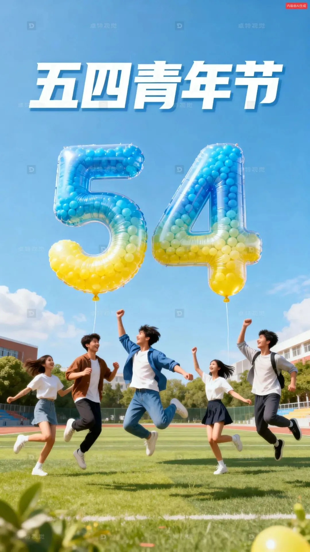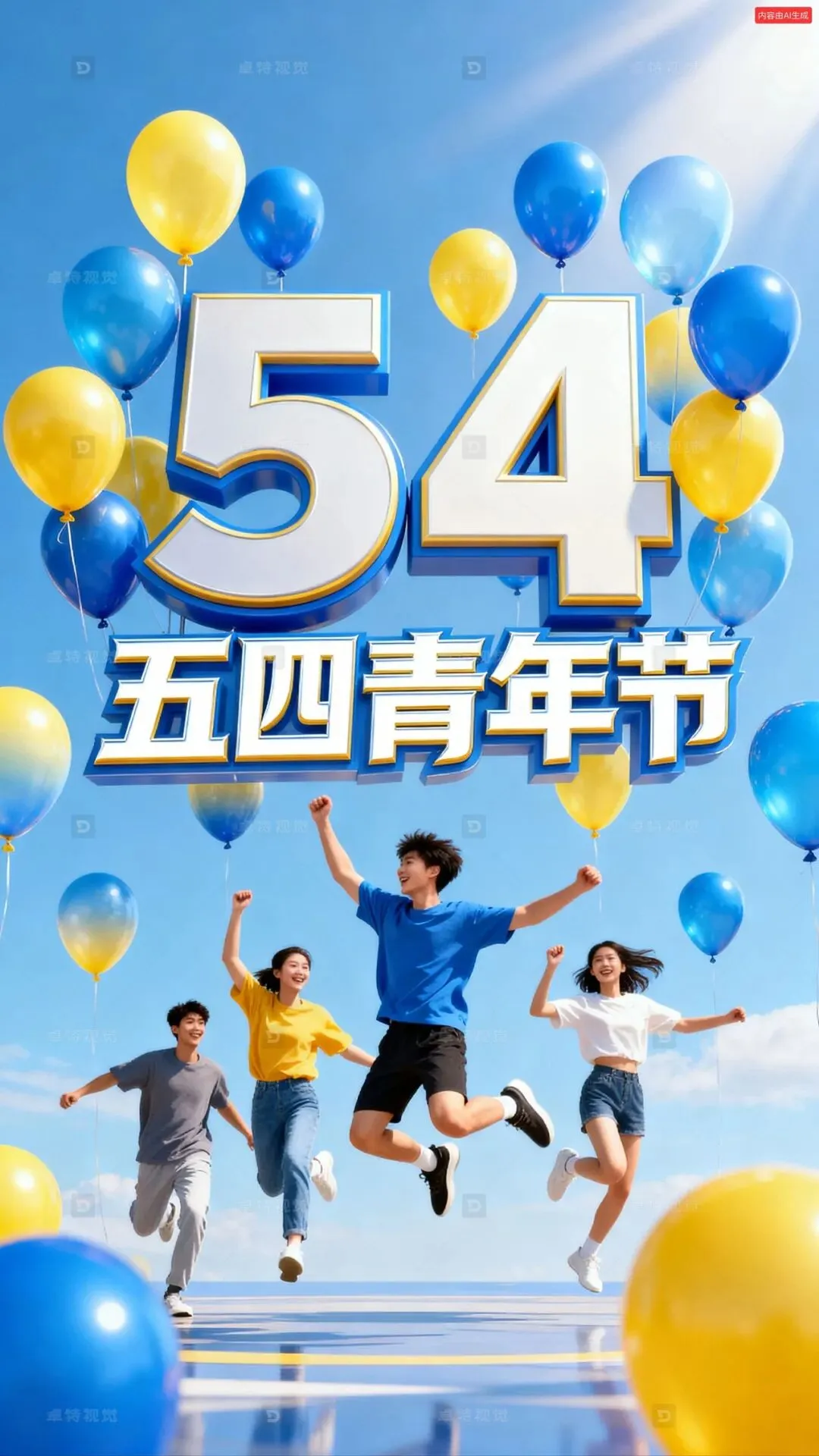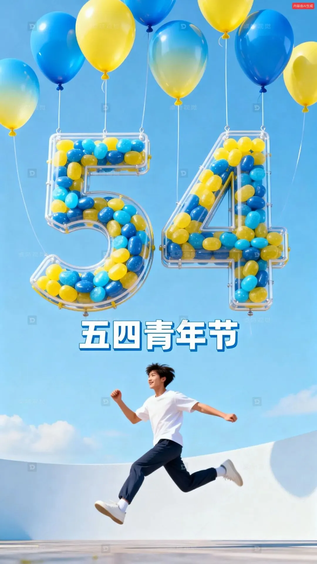3D艺术写实风,氦气糖果数字艺术装置,数字"54"悬浮在半空中,气球是蓝黄渐变,下方是跳跃起来的青年人,海报整体风格符合54青年节,构图合理,充满活力,主标题“五四青年节”广告字体,有力度。