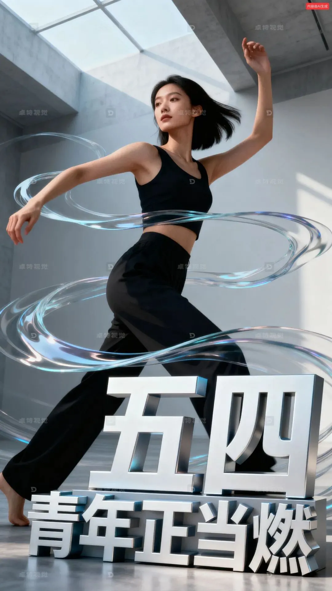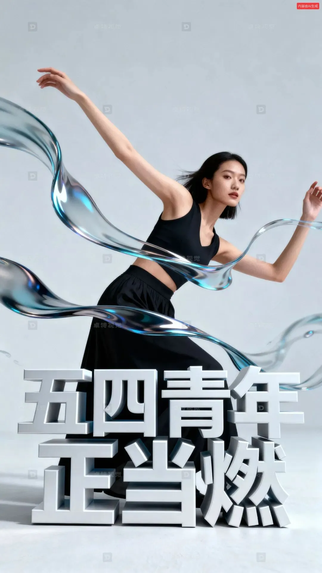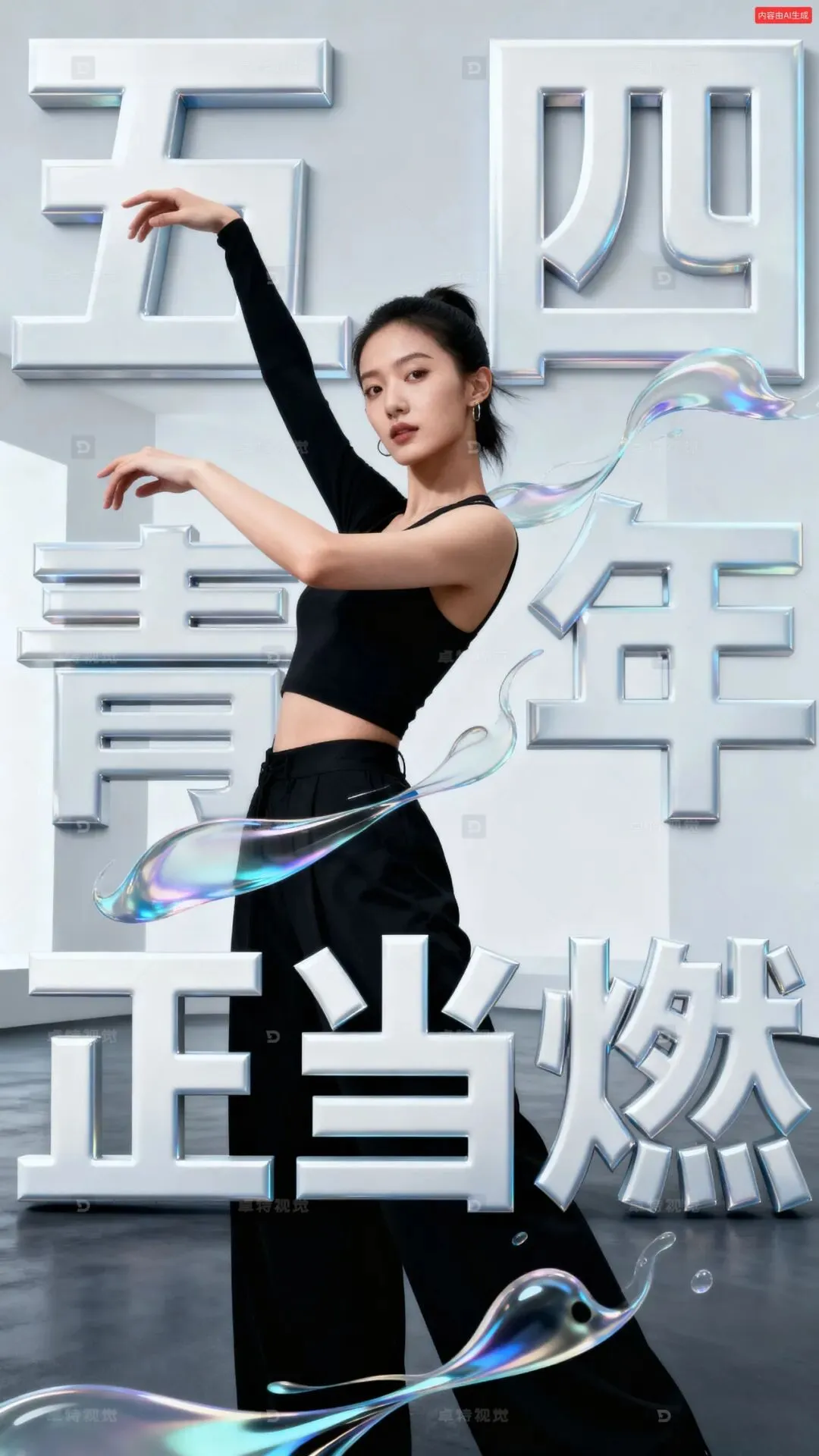 女子人像海报,人像摄影,超现实极主义,极简主义,文字排版文字设计,OC渲染,动态视觉设计。人物与立体字巧妙的结合,形成冲击力的画面效果,加上流体动态设计穿插人物与字幕之间,形成更好的画面效果。文字“五四青年正当燃”,优雅前卫的动作,动态视角,获奖作品,画面动感且有韵律,空间感层次感,艺术氛围感。