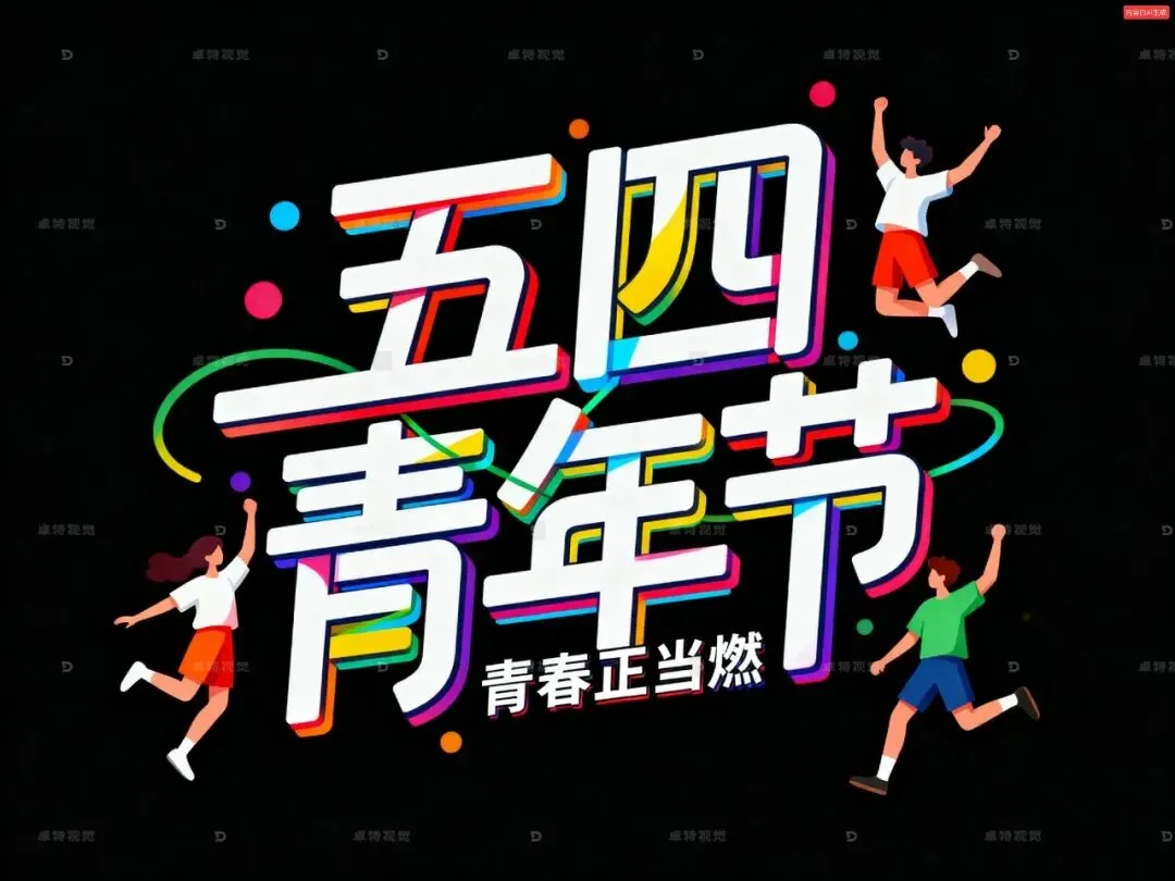 矢量插画,涂鸦风格,黑色背景,彩色渐变字,创意立体字体设计Logo,线条硬朗且富有艺术张力,中文标题“五四青年节”,将字体进行抽象变形,给人以强烈的视觉冲击,笔画之间合理交错,彩色点缀,小字标题“青春正当燃”,字体周围是穿着不同衣服的年轻人在跳跃,高级感,扁平化,大师作品。