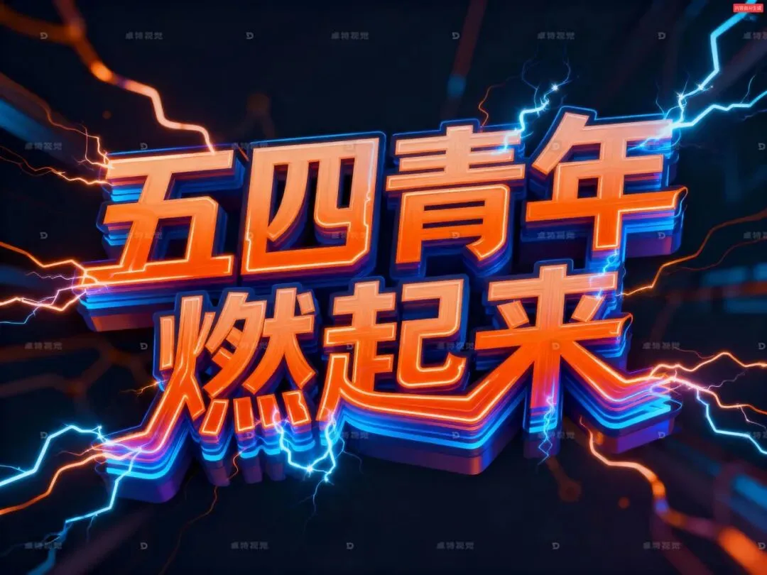 制作创意艺术字,文字信息:“五四青年 燃起来”字体向四角变形扭曲成运动形状,立体字,使用荧光橙+钴蓝渐变模拟神经递质释放,电流脉冲式字体抖动特效。动感,动力感。