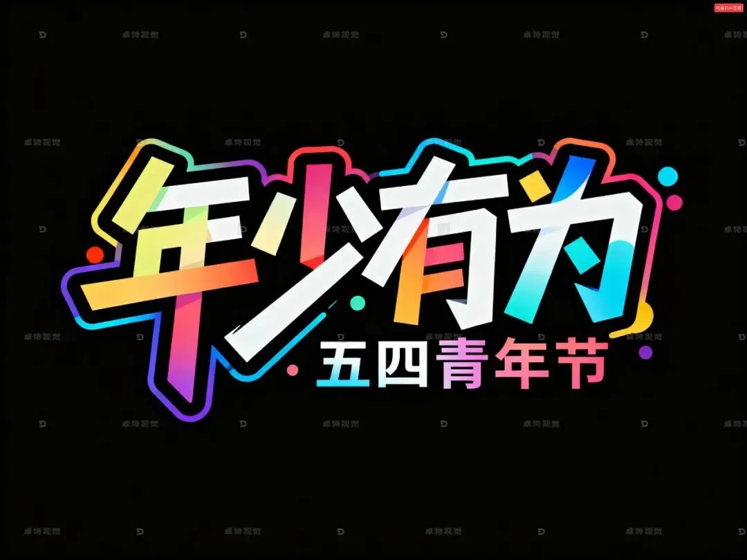 矢量插画,涂鸦风格,黑色背景,彩色渐变字,创意字体设计Logo,线条硬朗且富有艺术张力,中文第一行“年少有为”,小字中文第二行“五四青年节”,笔画之间合理交错,彩色点缀。设计灵感:将字体进行抽象变形,给人以强烈的视觉冲击。高级感,扁平化,大师作品。