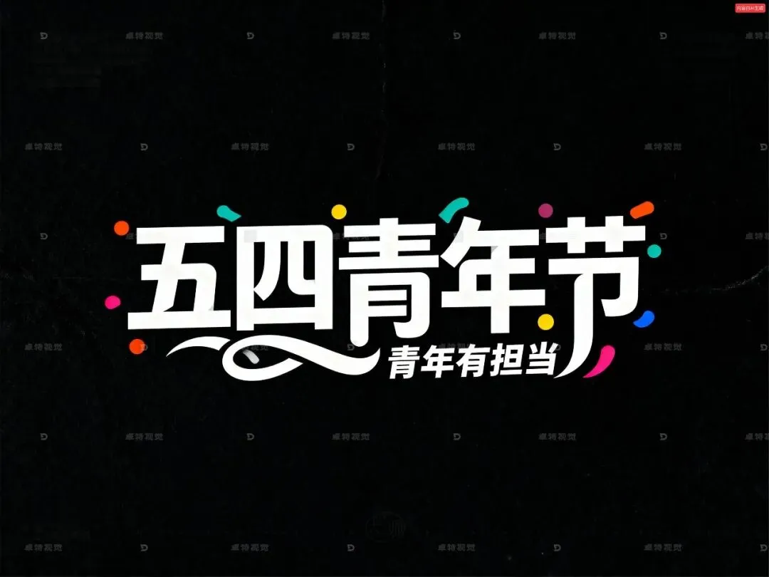 矢量插画,标志,黑色背景,白色字,创意字体设计Logo,流畅且富有艺术感,中文大主标题“五四青年节”,小字副标题“青年有担当”,笔画之间合理相连,彩色点缀。设计灵感:将字体进行抽象变形,给人以强烈的视觉冲击。高级感,扁平化,大师作品。