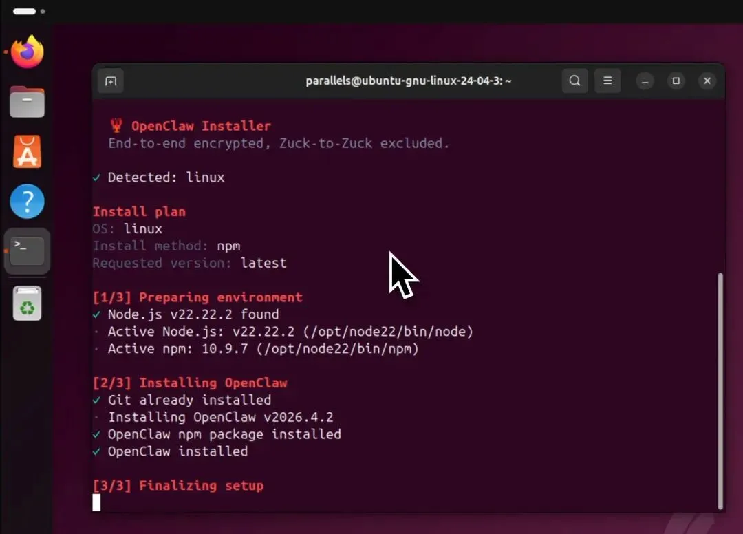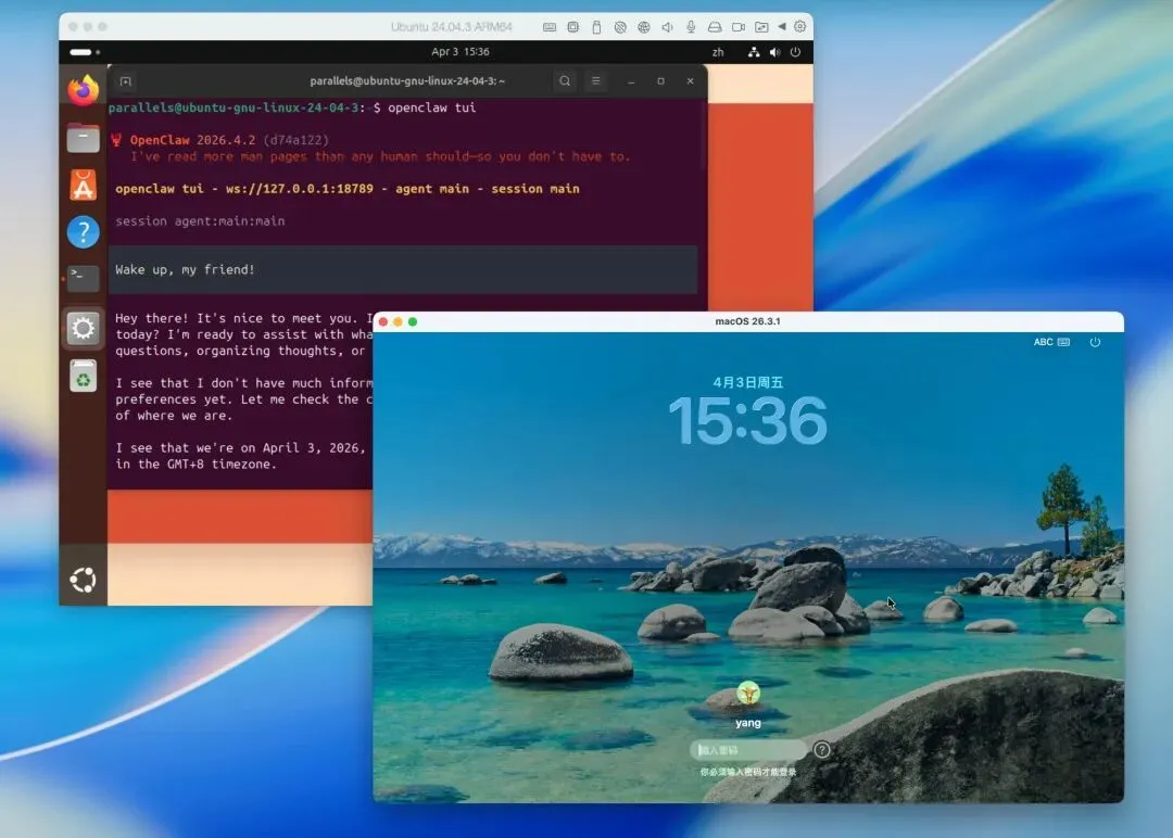 用 Parallels Desktop 安装 Linux 虚拟机同样很简单。软件提供好几种不同的 Linux 可以直接下载安装。而且 Linux 系统比较小,下载和安装通常很快。我对 Linux 操作系统不熟悉,但是 Linux 跟 macOS 有非常多的相似之处,不难上手。在 Linux 里安装 OpenClaw 的流程跟在 macOS 里几乎一样,这里就不展开了。
