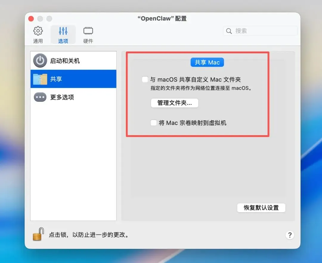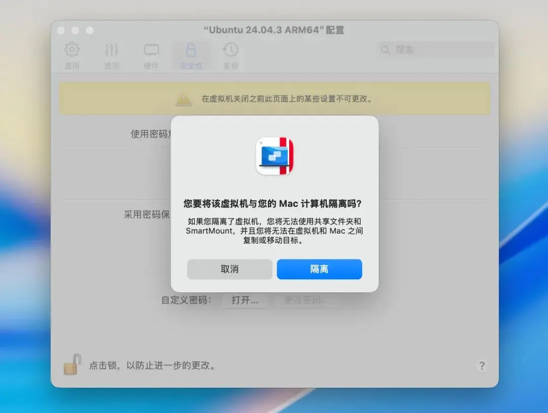如果你想让 macOS 虚拟机跟你的 Mac 宿主机完全隔离,可以在 Parallels Desktop 的虚拟机设置里面把「共享」相关的选项都关掉。在 Linux 的配置设置里也可以勾上「隔离 Linux 和 Mac」。