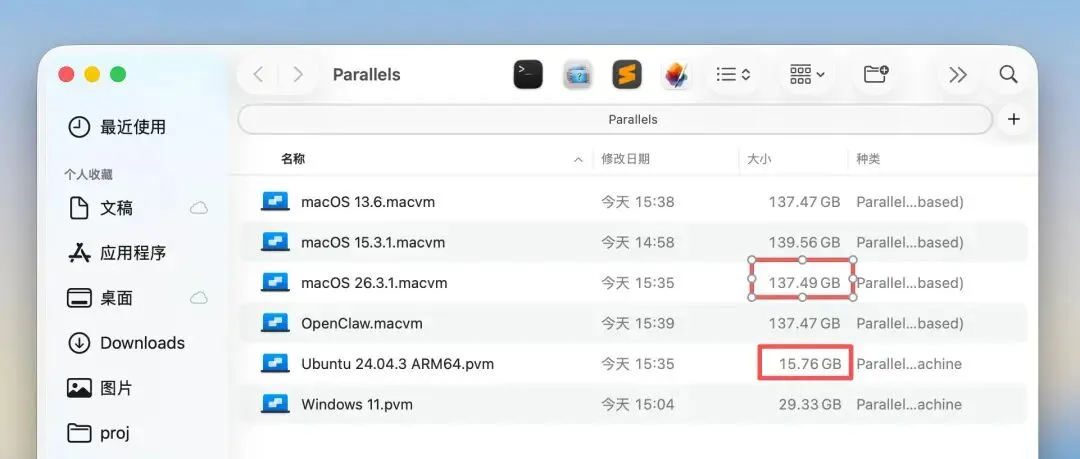 OpenClaw 都挂着的情况下,我安装的这个 Linux 虚拟机大概占用不到 4GB 的 Mac 内存,macOS 虚拟机大概占用 8 GB。Linux 虚拟机对磁盘空间只占用了 14 GB,macOS 虚拟机用了 130 GB。相比来说 Linux 虚拟机还是比较「轻量」的。想节省 Mac 宿主机的本地磁盘空间,也可以把 macOS 虚拟机放在移动固态硬盘里。
