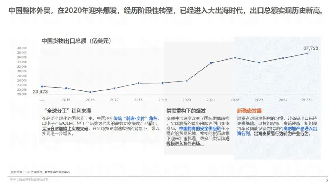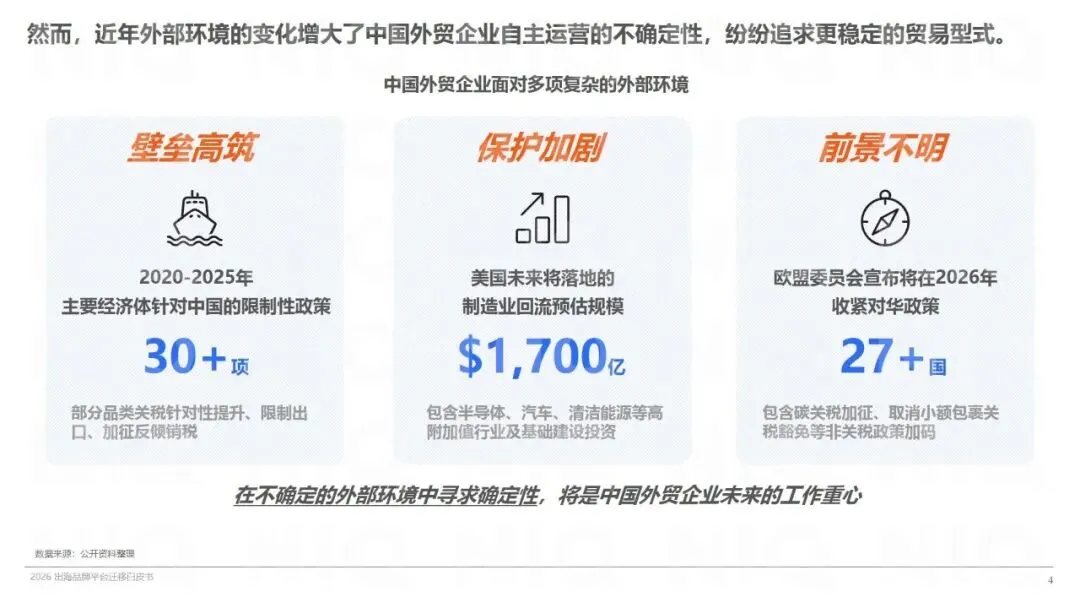 当前中国外贸已迈入大出海时代,出口规模屡创新高,同时面临全球分工红利消退、贸易壁垒高筑、制造业回流及合规政策收紧等多重外部挑战,企业亟需在不确定性中寻找稳定增长路径。跨境电商凭借灵活生产、直面终端、自主定价、本地合规、风险分散等优势,成为品牌出海核心引擎,行业规模、经营主体数量持续增长。全球跨境消费需求持续升级,消费者购物平台迁移趋势显著,中国出海平台凭借高性价比、丰富品类与优质服务吸引力不断提升,品牌化与服务能力成为消费增长核心驱动力。