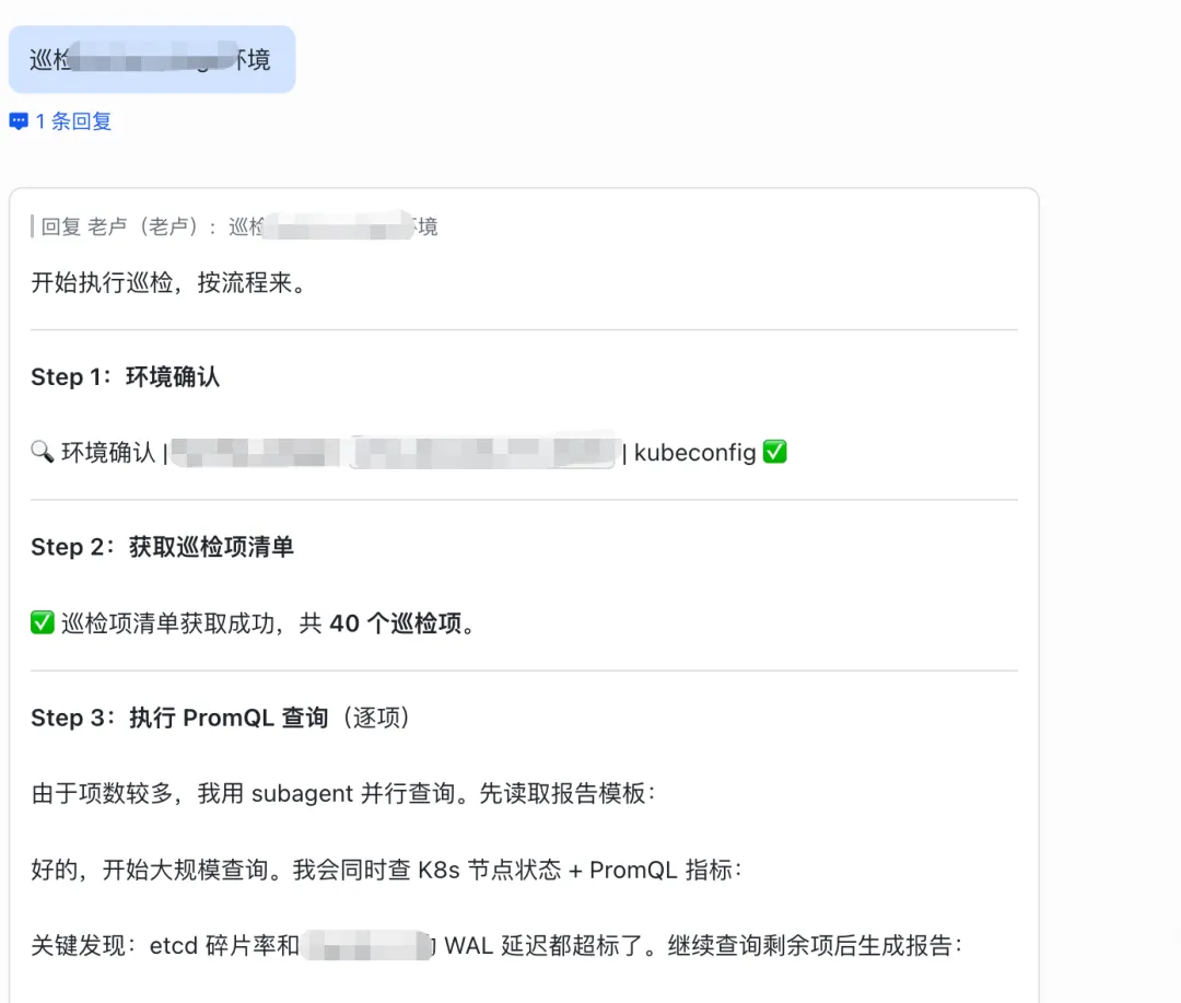 环境确认:队长从配置文件读取本次巡检的目标环境,获取Prometheus URL和集群凭证,打印确认信息后开始工作。
