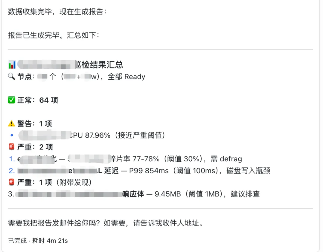 目前该巡检系统已稳定运行,每日定时对生产环境和预发环境各执行一次。异常指标通过邮件实时推送,报告包含具体的实例名称、数值和阈值对照,运维人员可以直接定位问题根因。