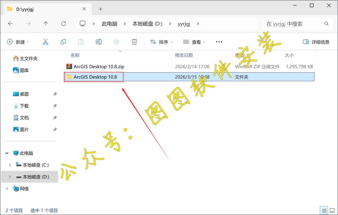 1.将ArcGIS Desktop 10.8软件安装包下载到电脑上,我是下载到D盘的一个英文文件夹内。右键ArcGIS Desktop 10.8软件安装包,点击【解压到当前文件夹】