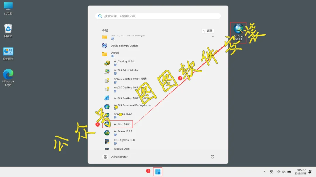20.回到电脑桌面上,点击【Windows徽标】,找到【ArcMap 10.8.1图标】,并长按鼠标左键将软件图标放置到桌面,完成ArcGIS Desktop 10.8软件快捷方式的创建
