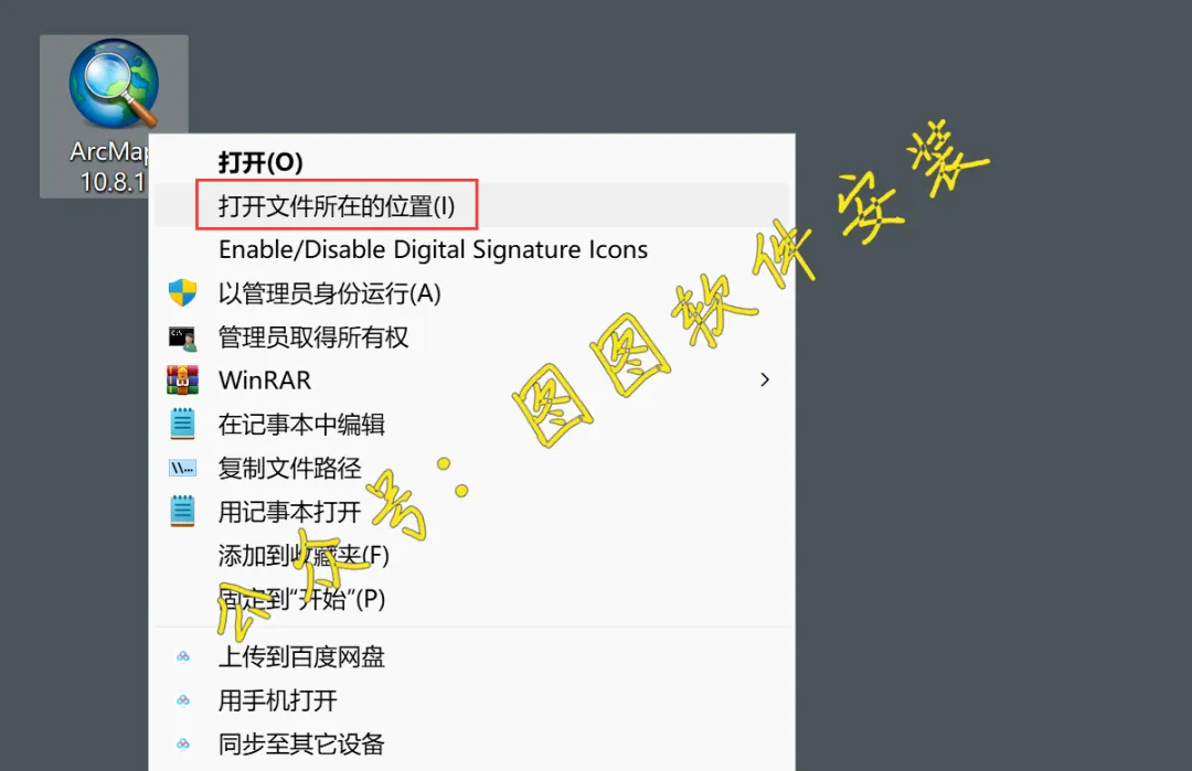 21.回右键【ArcGIS Desktop 10.8软件快捷方式】,点击【打开文件所在位置】