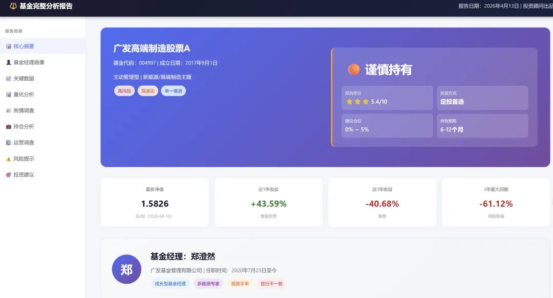 4. 投资顾问(综合判断模块)整合各模块信息,评估基金经理知行合一程度,综合业绩与风险因素,形成最终投资结论。