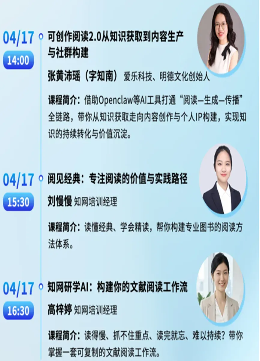 为助力我校师生熟练运用数字资源、掌握AI系列工具,提升数字素养与阅读效率,图书馆现依托中国知网举办“数字阅读与阅读能力提升公益线上培训--智读时代:AI赋能数字阅读”专题系列讲座。讲座将围绕深度阅读、AI赋能与多场景知识服务,全面升级您的阅读方式。欢迎大家准时收看!