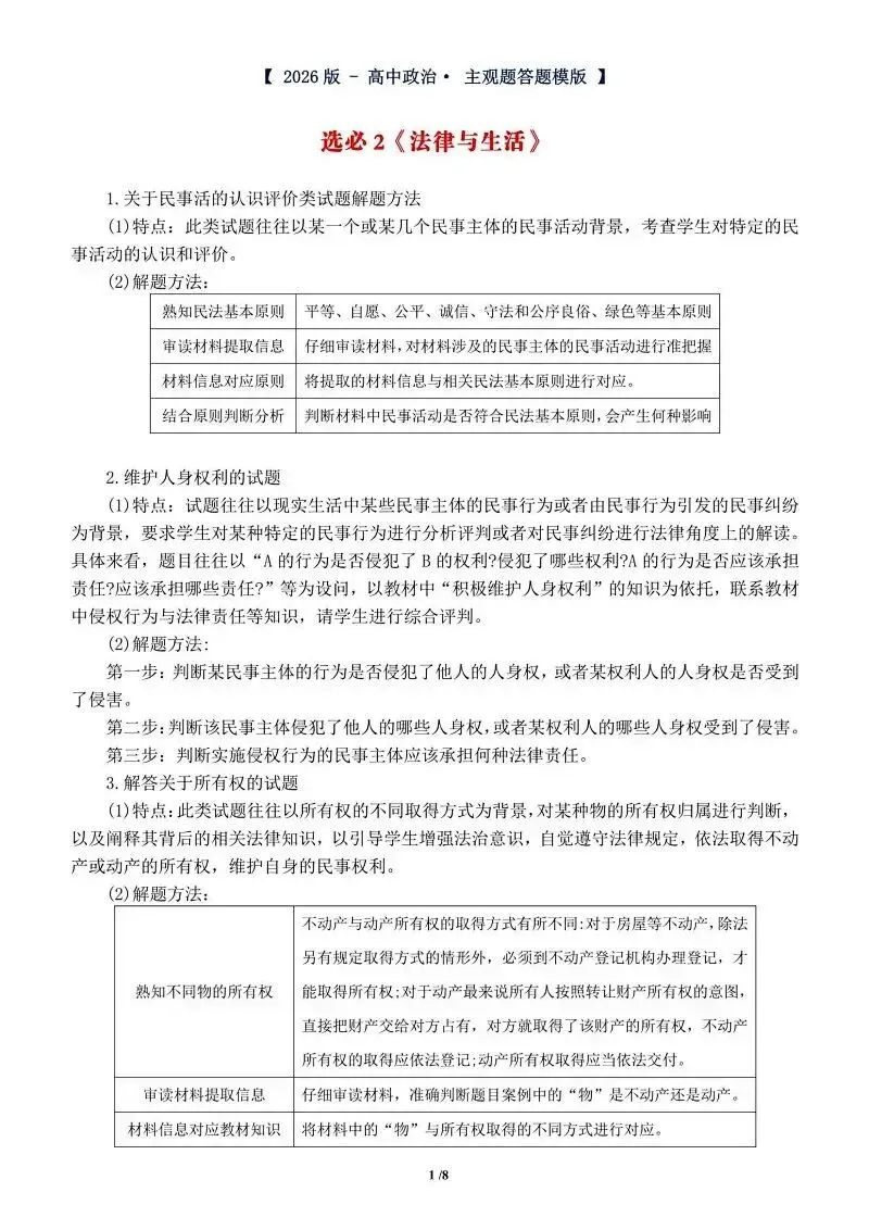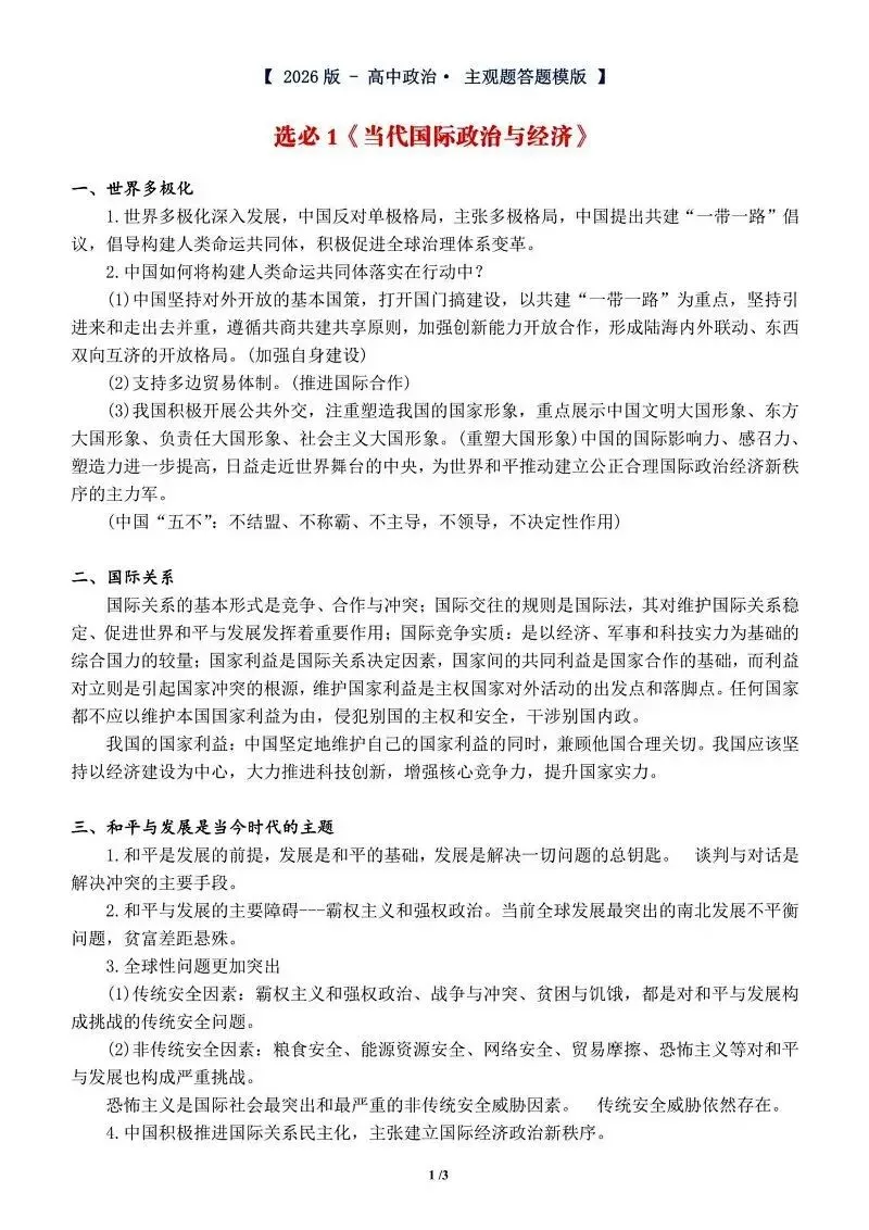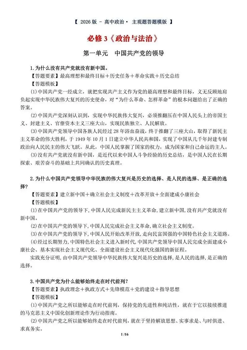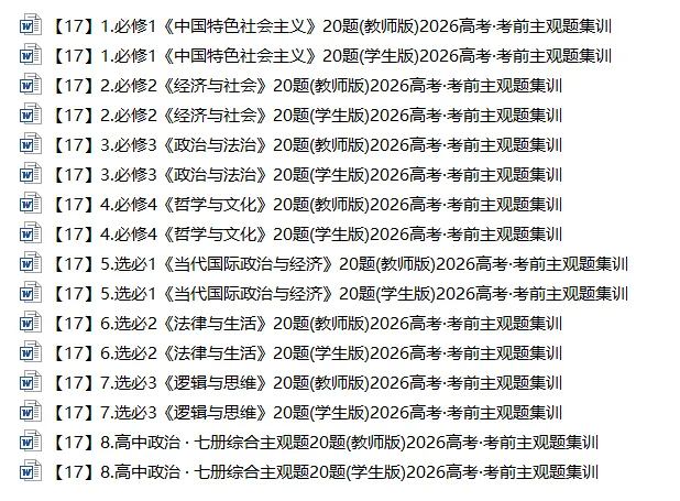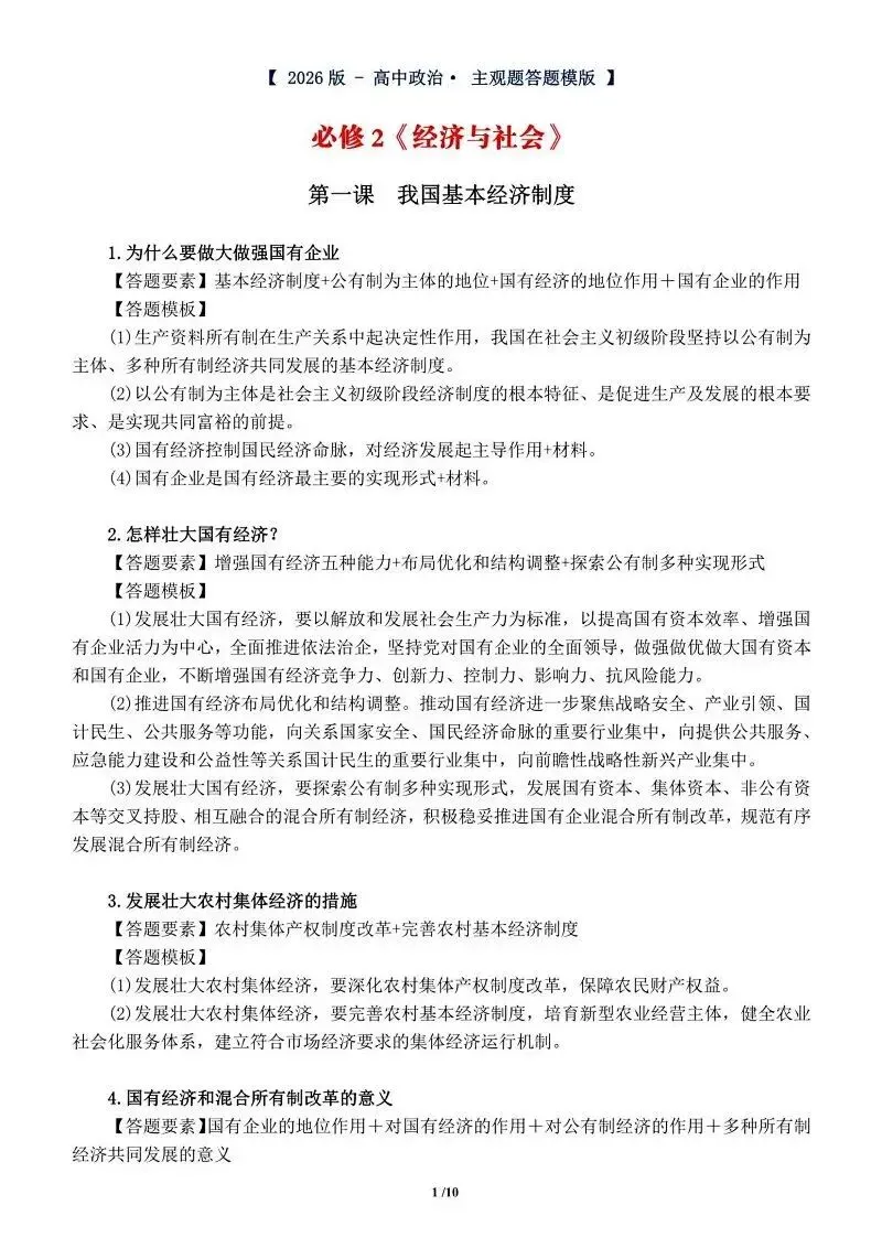 这篇整理了高中政治 7 本书全套主观题答题模板,搭配2026 考前主观题 160 道集训(8×20),全是最新模拟题、高频考点、标准踩分答案。