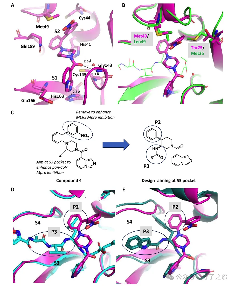 通过初步构效关系研究,团队获得了活性更高的化合物4(IC₅₀ = 840 nM)。X射线晶体结构分析显示,该化合物与SARS-CoV-2 Mpro的结合模式中,硝苯基团与Met49发生范德华相互作用,这解释了为何该化合物对MERS效果不佳——因为MERS中相应位置的氨基酸不同,产生了空间位阻。