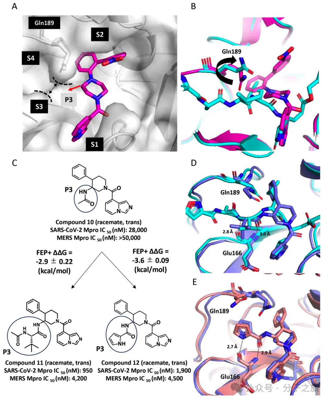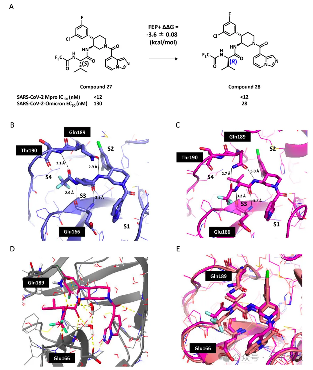 团队采用自由能微扰(FEP)计算来预测结合亲和力,这种方法能够充分考虑蛋白质的构象动态变化和诱导拟合效应。通过FEP+计算,他们成功预测了在P2和P3位点引入特定取代基可显著提高效价,这一预测得到了实验验证。