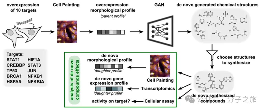生成对抗网络(cGAN)在细胞形态数据指导下,成功设计了针对10个癌症靶点的新型化合物。研究人员从中选择76个最有可能的候选化合物进行合成与实验验证,这是迄今为止最大规模的AI生成化合物实验验证研究。