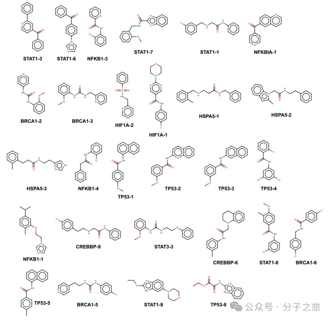 特别令人印象深刻的是,所有针对TP53、STAT3和JUN靶点生成的化合物都表现出生物活性。