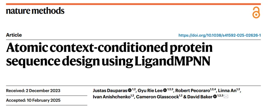 2025年,美国华盛顿大学生物化学系David Baker团队在《Nature Methods》(IF=36.1)上发表题为“Atomic context-conditioned protein sequence design using LigandMPNN”的研究论文,提出一种基于深度学习的能够显式模拟非蛋白质组分的蛋白质序列设计方法—LigandMPNN。该方法在恢复与小分子、核苷酸和金属相互作用的天然氨基酸序列方面显著优于现有的Rosetta和ProteinMPNN方法。该方法提高蛋白质与非蛋白质分子相互作用的设计能力,从而为酶、传感器和结合蛋白的设计提供更高效、更准确的工具。