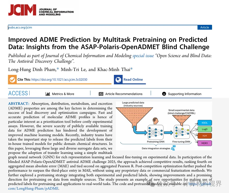 2025年,来自帝国理工学院和越南胡志明市医科大学的Long-Hung Dinh Pham、Minh-Tri Le与Khac-Minh Thai研究团队,在化学信息学领域重要期刊《Journal of Chemical Information and Modeling》上发表了题为“Improved ADME Prediction by Multitask Pretraining on Predicted Data: Insights from the ASAP-Polaris-OpenADMET Blind Challenge”的研究论文。