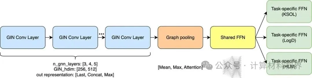共享底层编码器:使用图同构网络(GIN)层作为骨干,从分子图(2D结构)中提取通用特征。