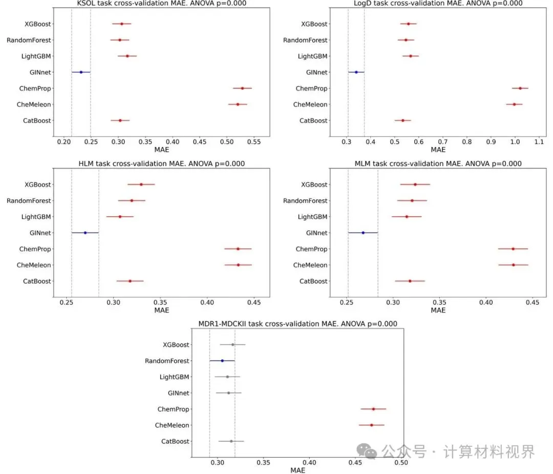 图2 五个任务的交叉验证MAE结果。 可视化显示了GINnet(蓝色)在KSOL、Log D、HLM、MLM四个任务上均显著优于传统机器学习基线模型(如随机森林、XGBoost)和其他GNN模型,展现了预训练策略的有效性。