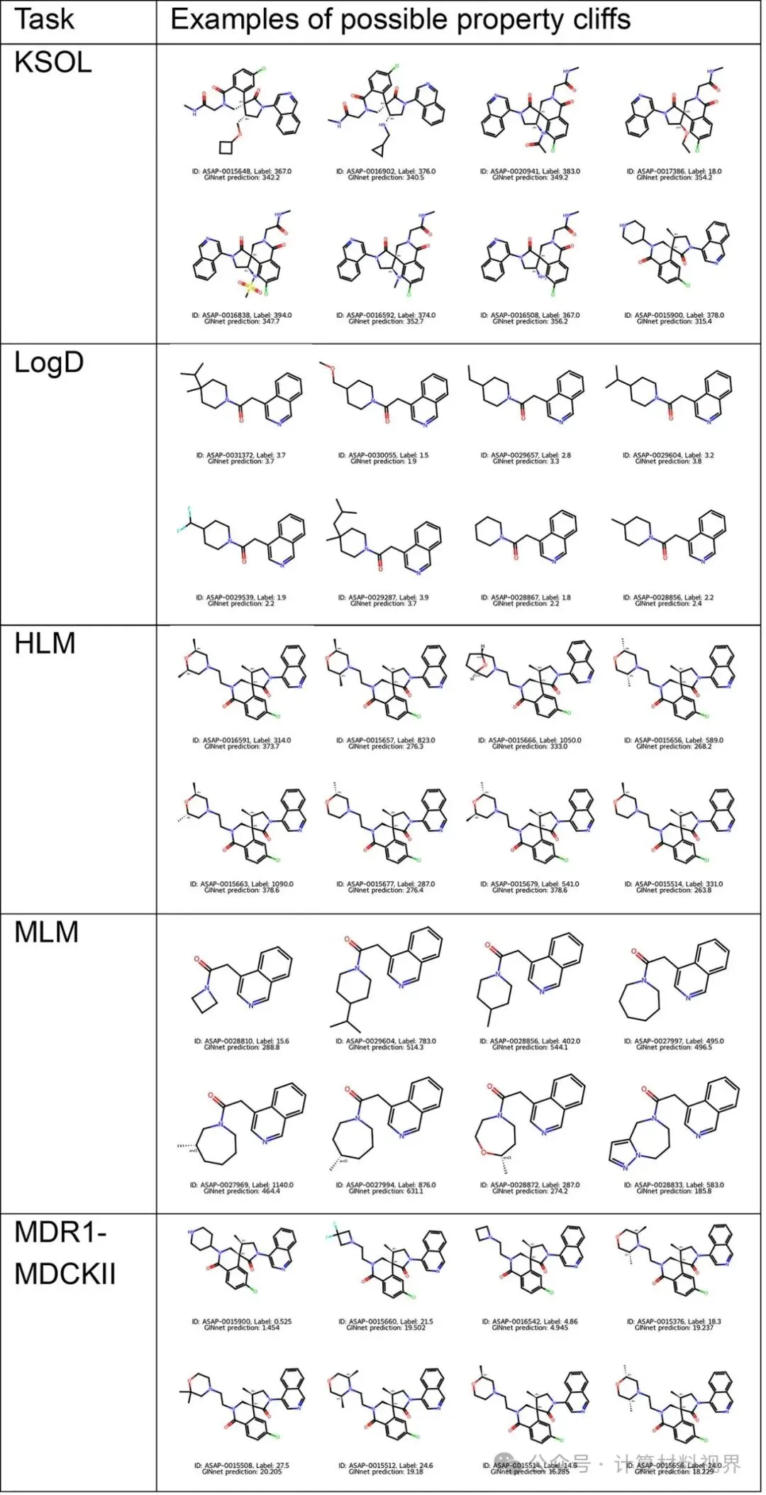 图5 竞赛任务中存在的性质悬崖示例。 展示了一系列结构仅存在微小差异(如取代基位置不同),但溶解度或清除率相差巨大的分子对。分析发现,在这些极端困难的案例上,即便是预训练模型也容易预测失误。