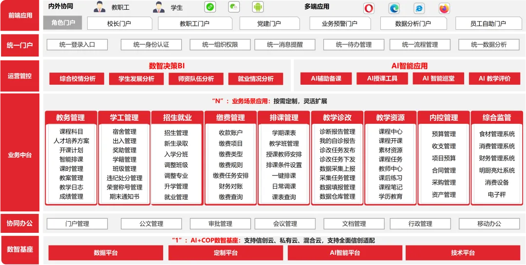我们打造“1个AI+COP数智基座+N个业务应用”的一体化管理体系,遵循“基座支撑—场景落地—生态保障—安全兜底”的全链路设计,完全匹配国家十五五智慧校园建设框架。