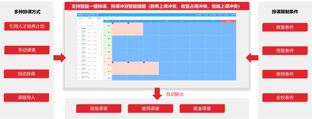 智能一键排课:内置多重冲突检测规则,自动规避教师、教室、班级冲突,支持手动微调,排课效率提升90%